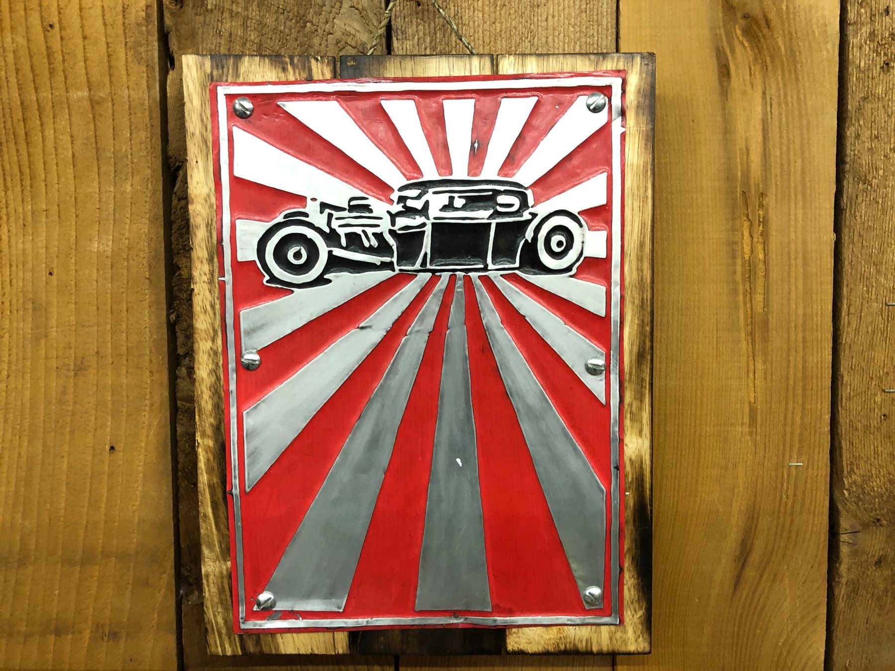Hot Rod, Classic Custom Car Metal on Wood, Reproduction picture, red, black and silver - approx 12in x 15in