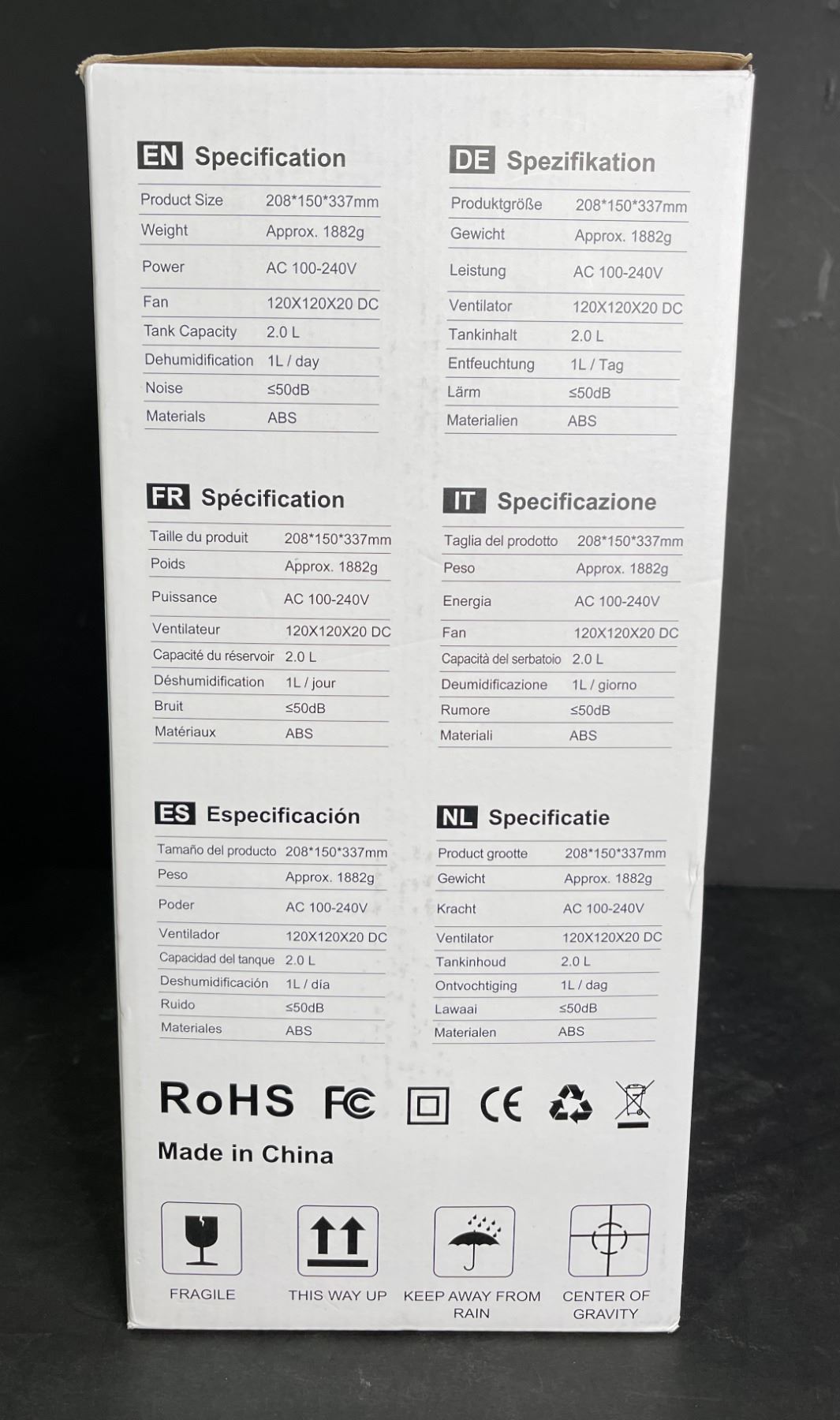 Household Dehumidifier 2L tank capacity, <50dB, approx. 4 pounds,  SIZE: 20.8 X 15 X 33.7cm