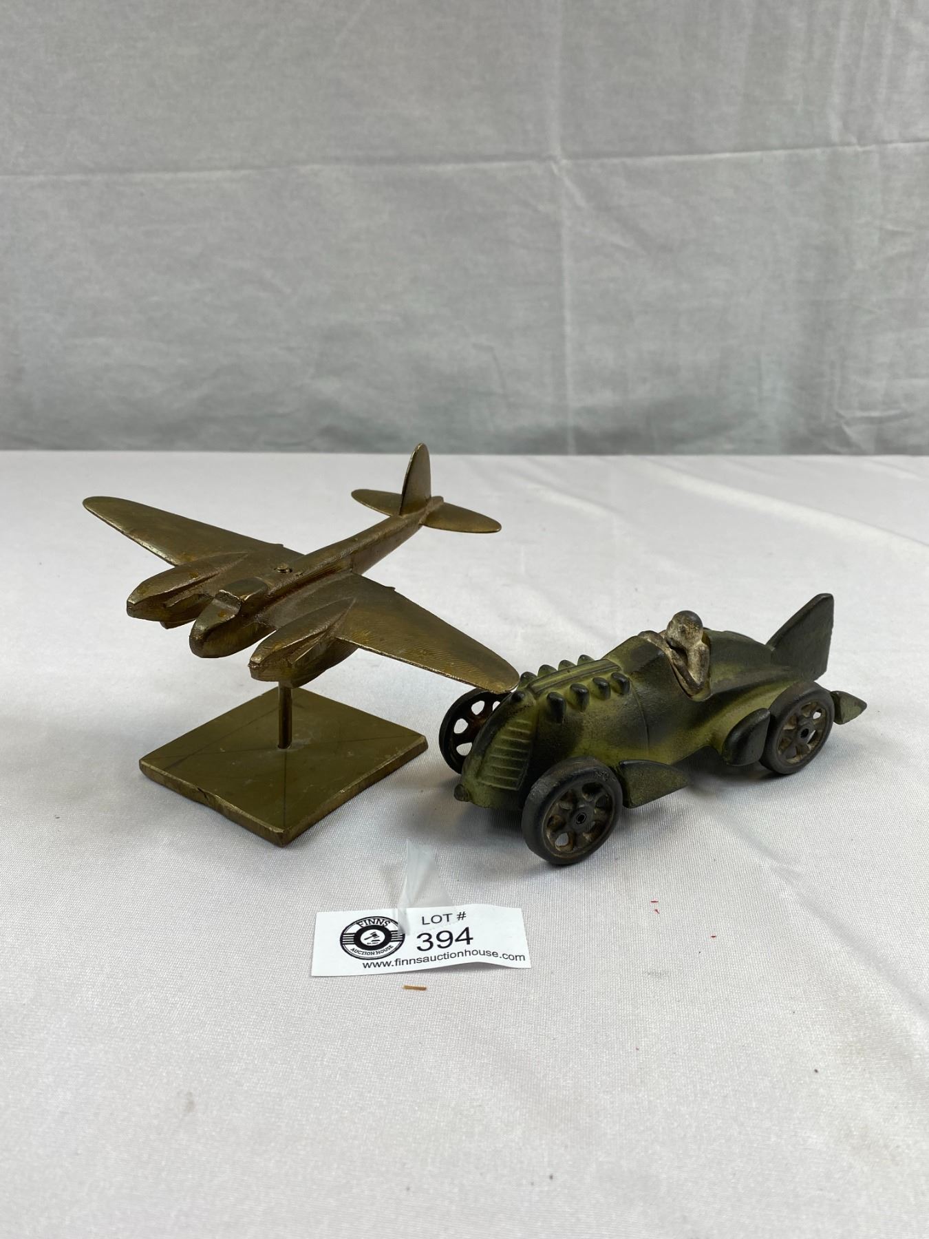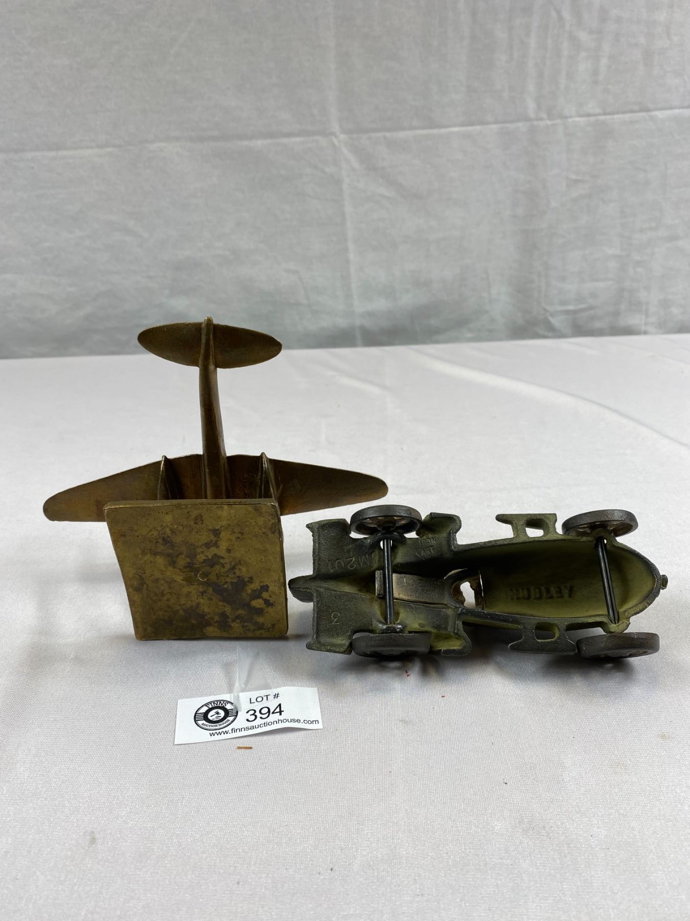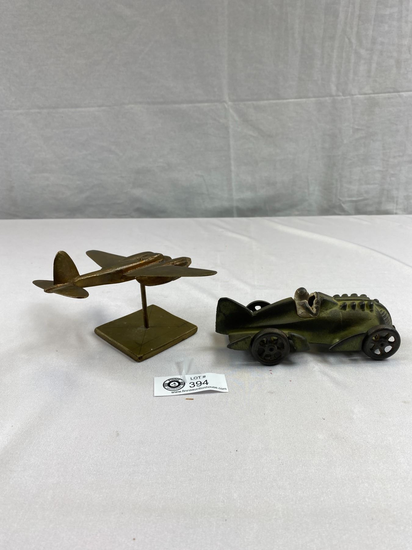 Hubley Cast Metal Race Car, JMZ01 And Brass Cast Airplane On Stand