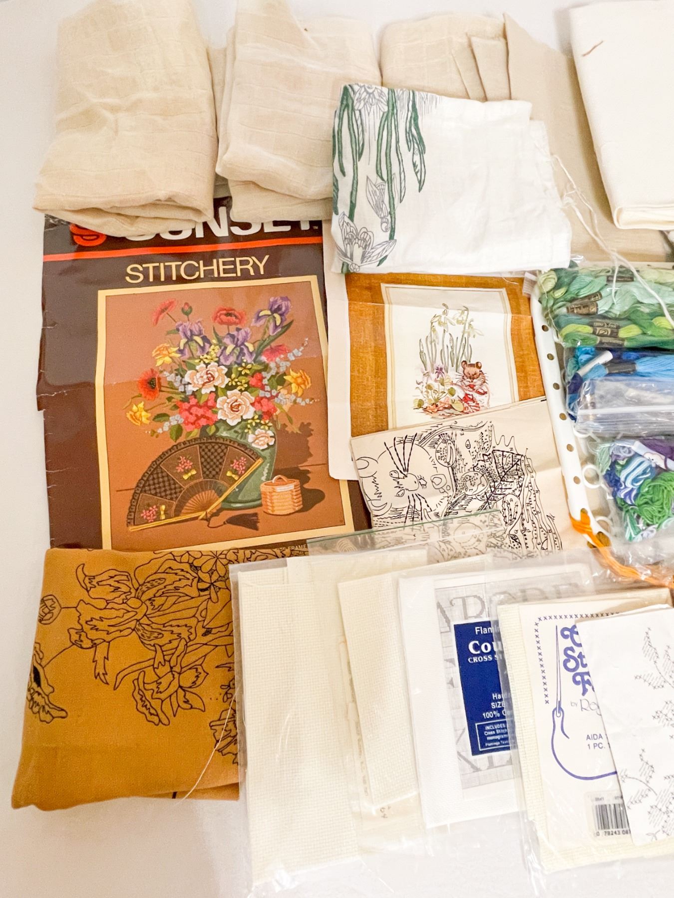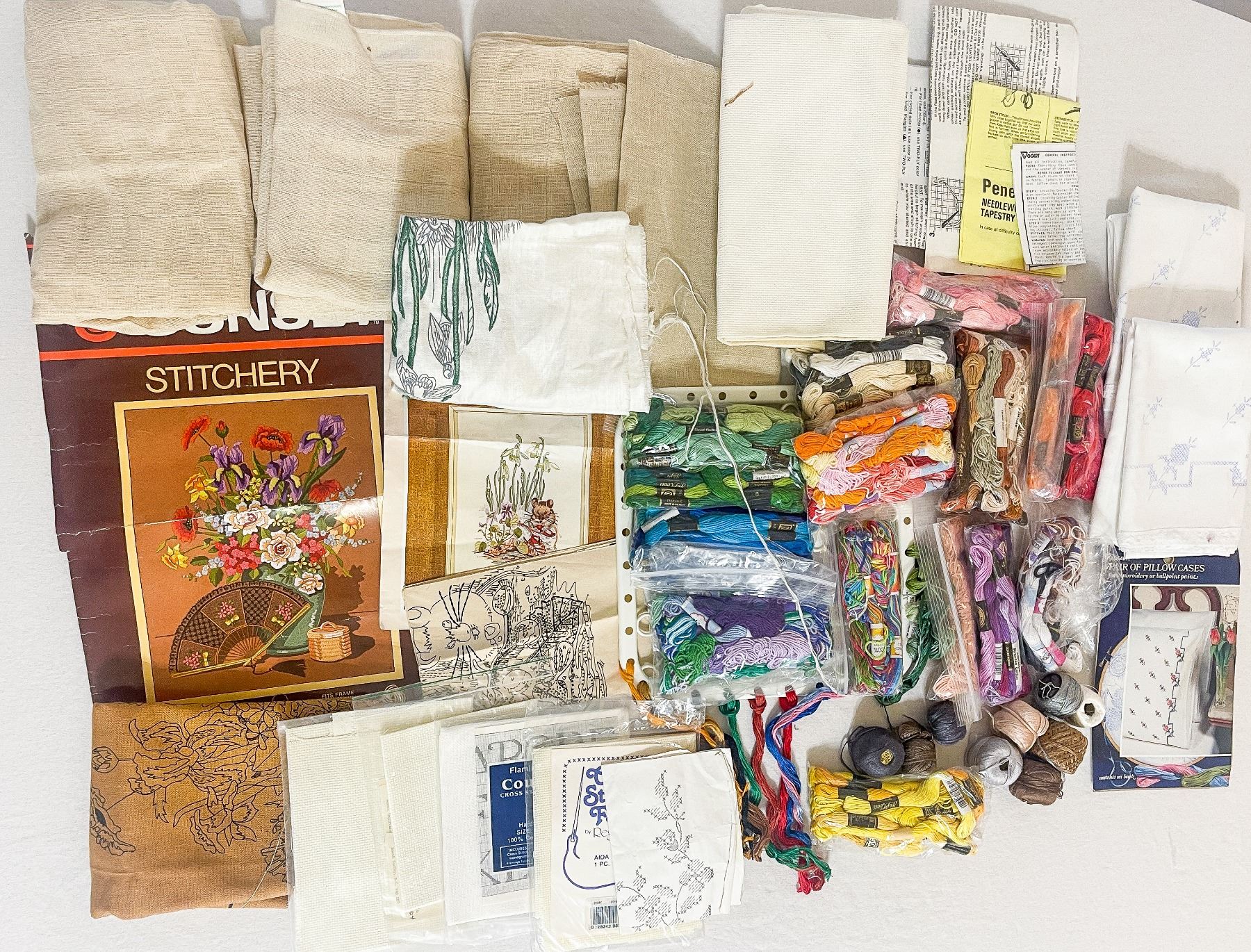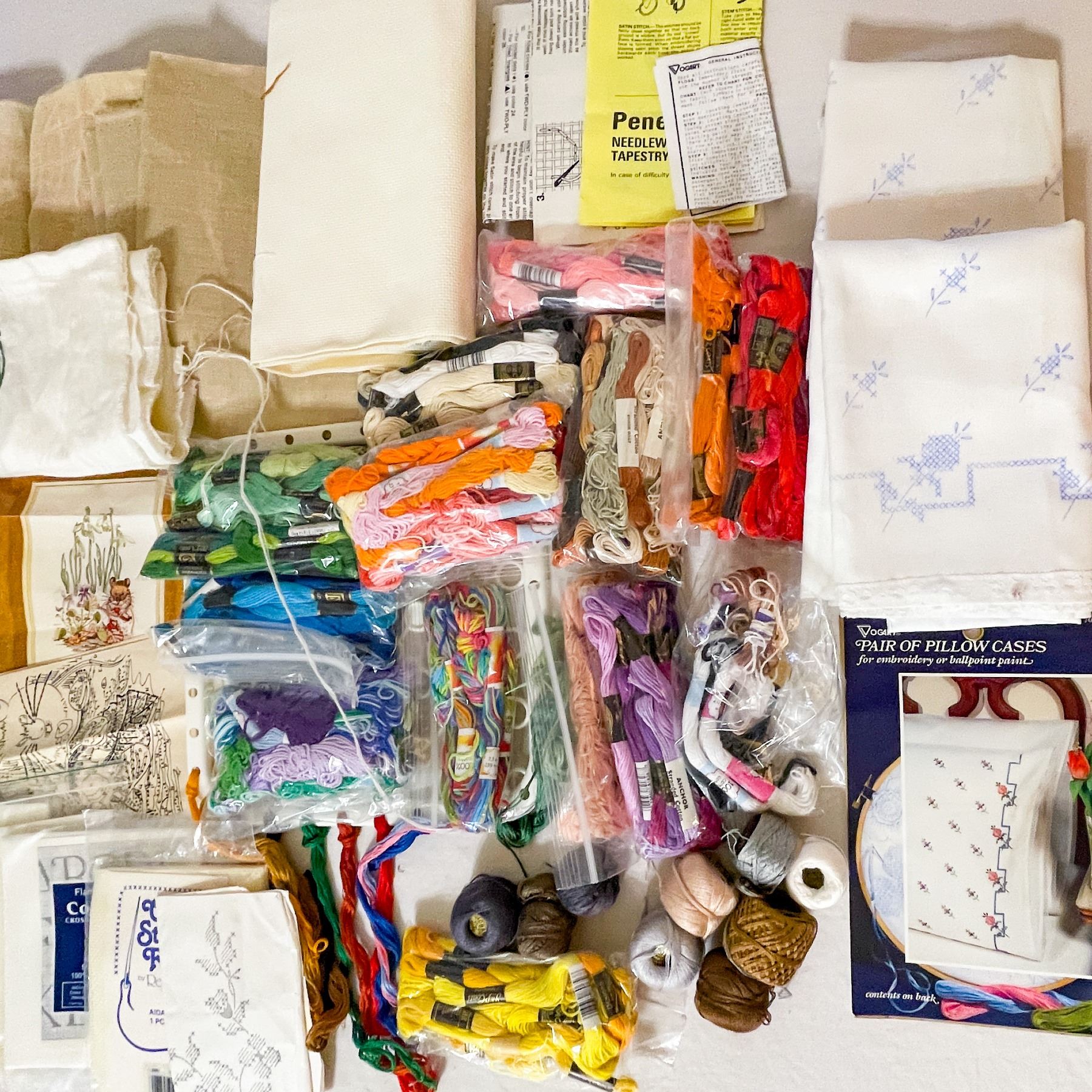 Large assortment of vintage cross stitch and embroidery supplies. Includes high-quality German-made organic cotton and linen canvases, embroidery floss/thread in assorted colors, patterns, and instructions for all pre-printed pieces. A great bulk lot for stitchers, crafters, or resellers.