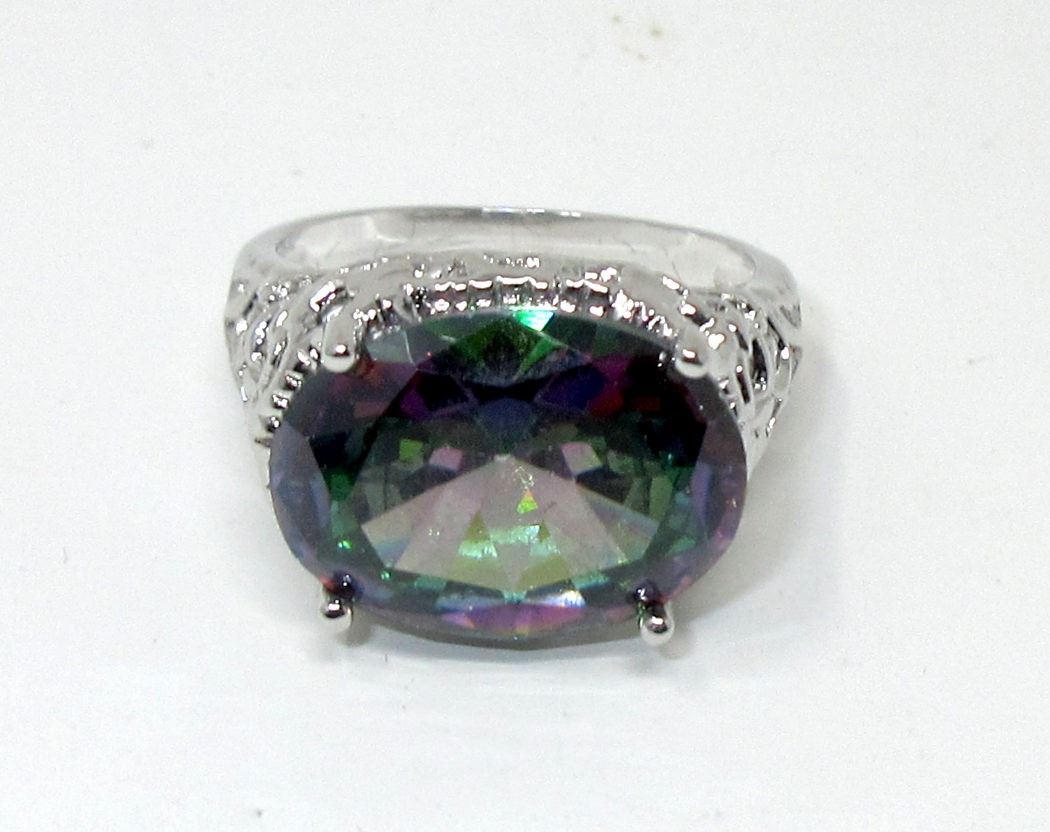 4 Claw setting holds an oval topaz. Pink, purple & green tones.