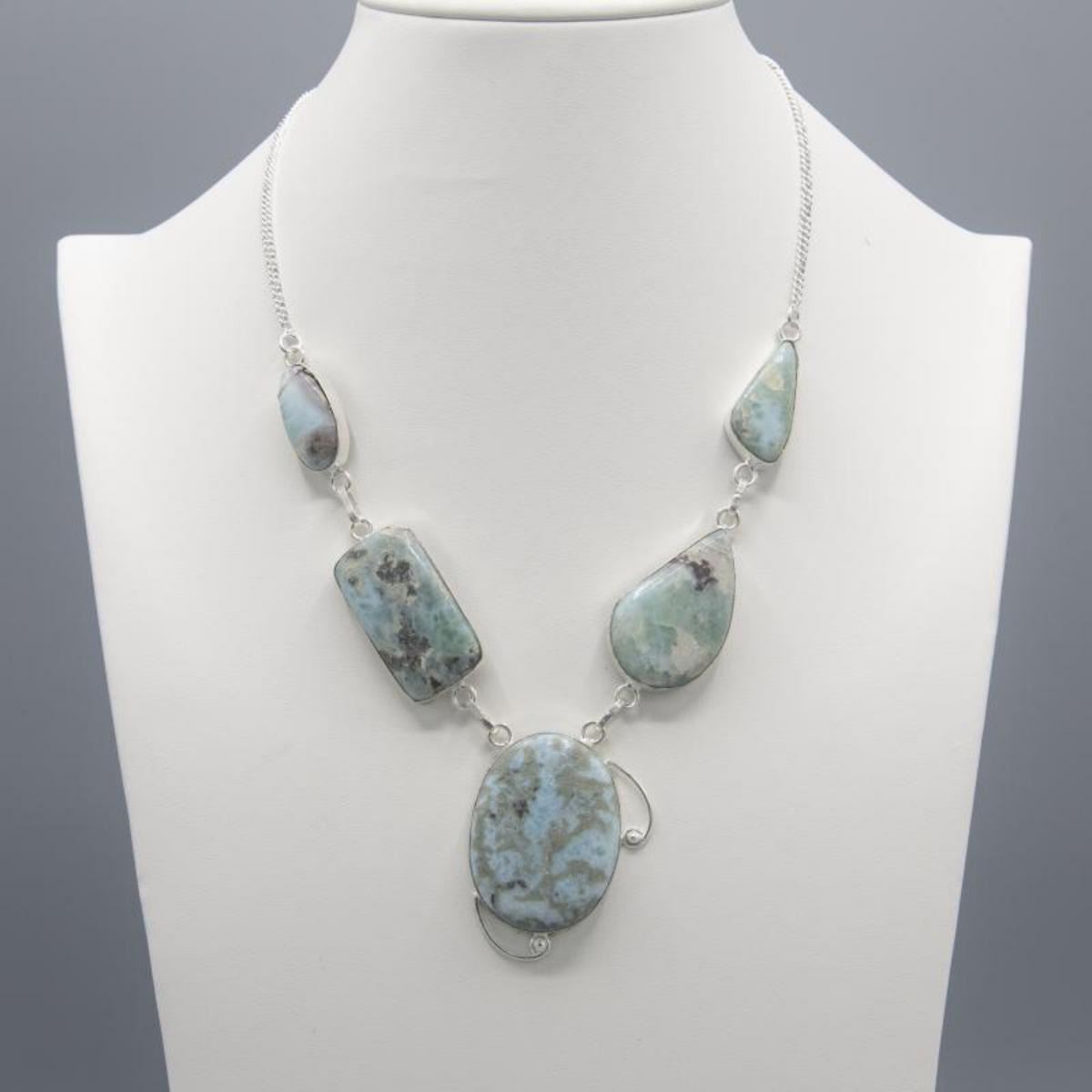 Huge Natural Carribian Blue Larimar Necklace. Approx. gem weight is 161 cts mounted in .925 sterling silver.20" long with a total gram weighrt of 54.6. Orgin : Puerto Rico