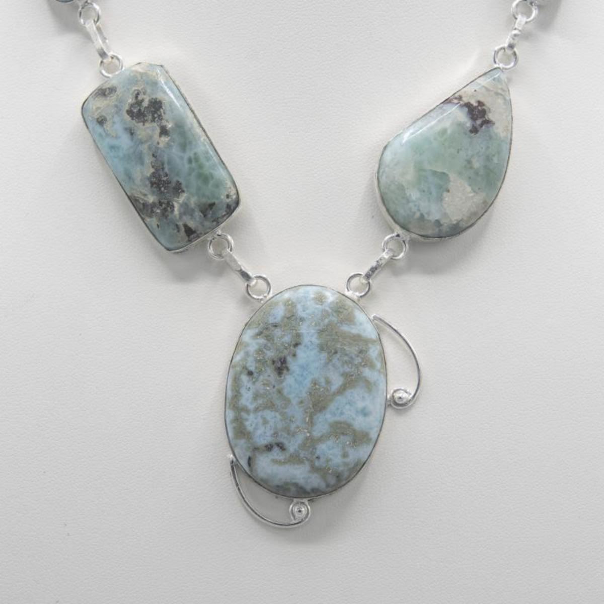 Huge Natural Carribian Blue Larimar Necklace. Approx. gem weight is 161 cts mounted in .925 sterling silver.20" long with a total gram weighrt of 54.6. Orgin : Puerto Rico
