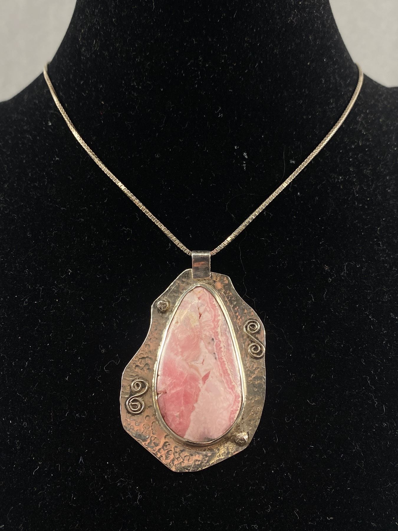 Huge Sterling Silver Navajo Handcrafted 2" Rhodochrosite Pendant & 21" 925 Box Link Chain - 20.3 Grams - Both Tested