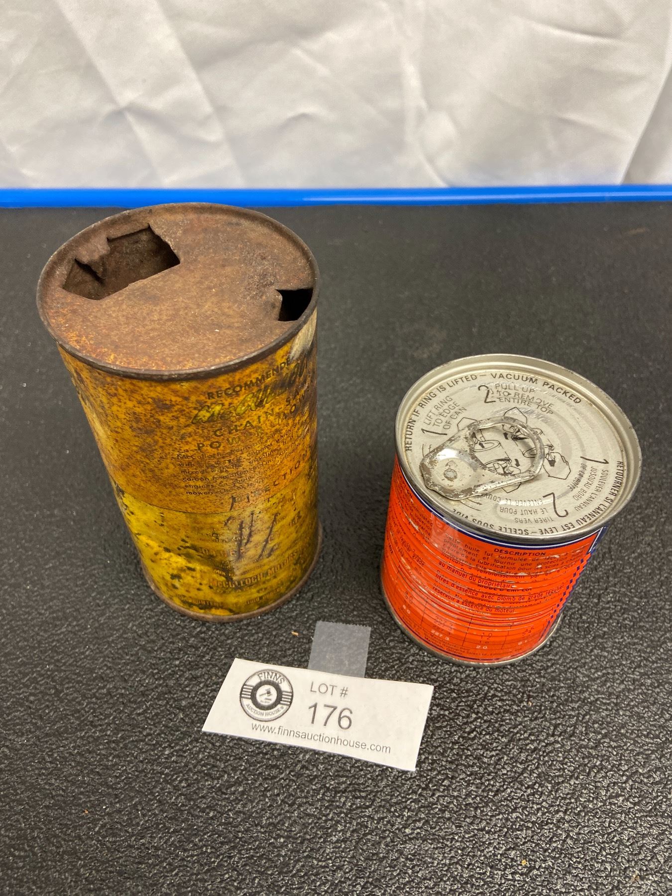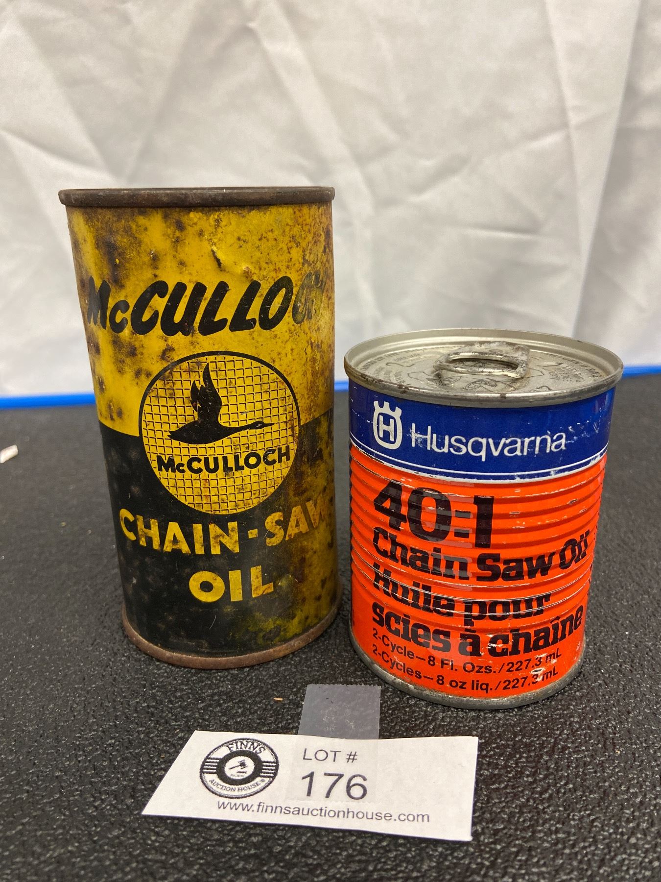Husqvarna Full Chain Saw Oil Tin and an Empty McCulloon Chain Saw Oil Tin
