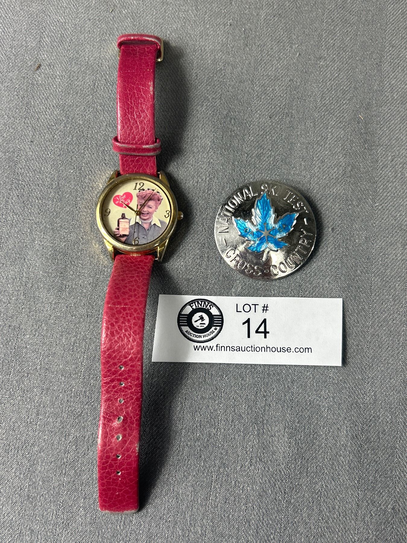 "I Love Lucy" Wrist Watch & National Cross Country Ski Test Pin.