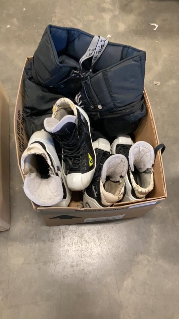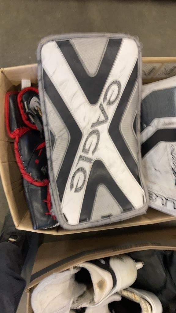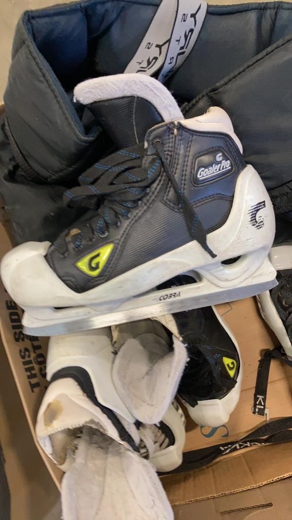 ICE HOCKEY GOALTENDER GEAR 33" MILLER PADS VAUGHN VELOCITY CATCHER, EAGLE BLOCKER AND 2 PAIRS OF GOALIE SKATES