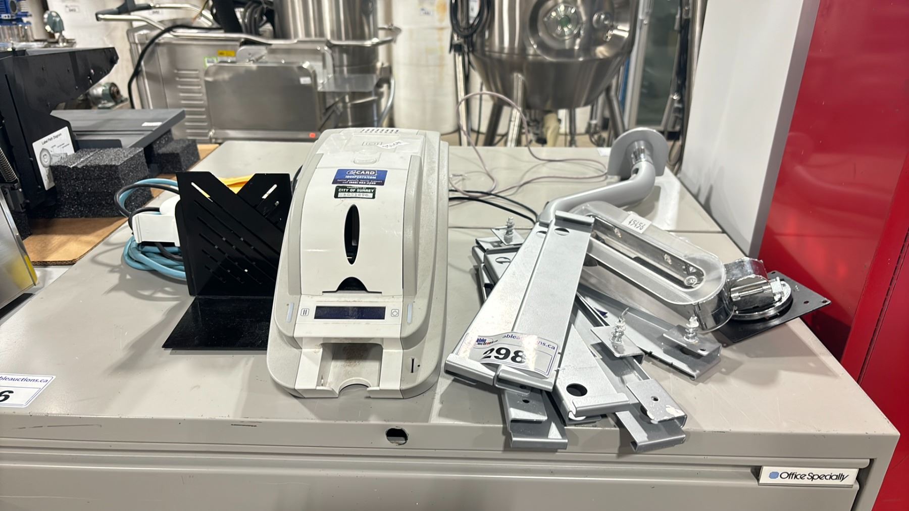 IDP SMART-50S CARD PRINTER, GREY METAL MONITOR MOUNT, 7 SLATWALL MOUNTING BRACKETS, POWER CORDS & METAL BOOKENDS