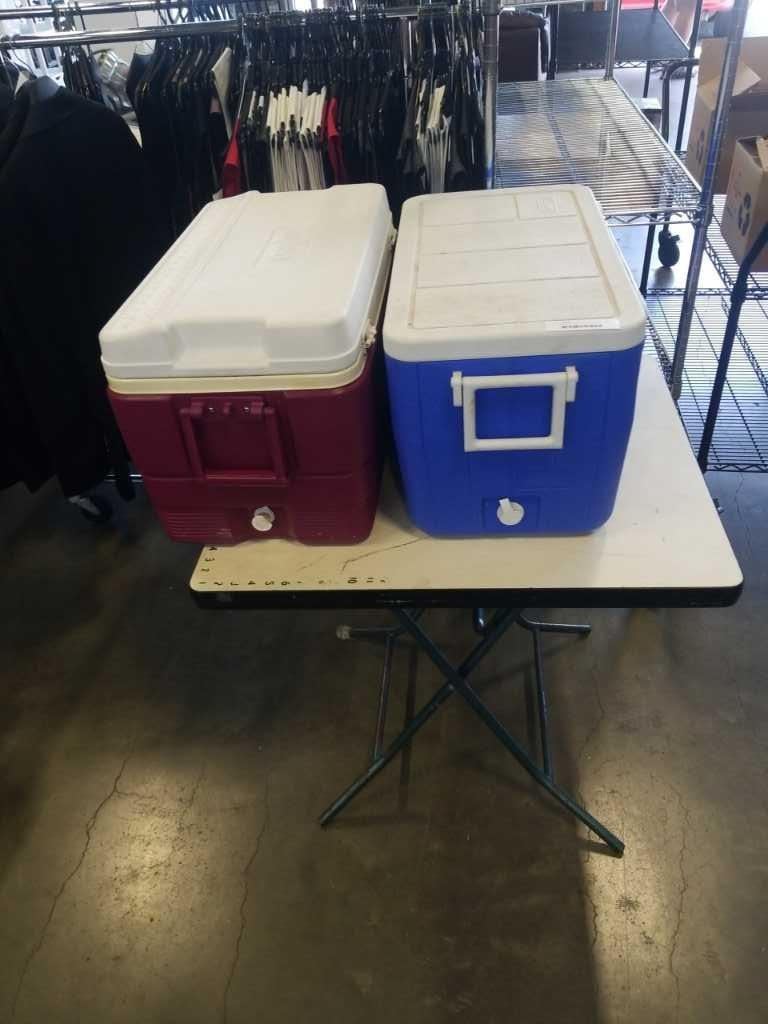 IGLOO AND COLEMAN COOLERS WITH POST DIGGER , HOE AND BROOMSTICK