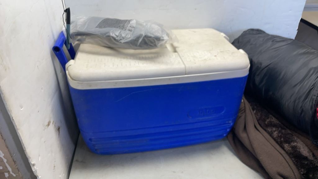 IGLOO COOLER WITH HEATER, SLEEPING BAG AND 2 BLANKETS