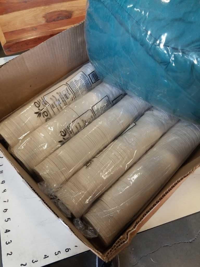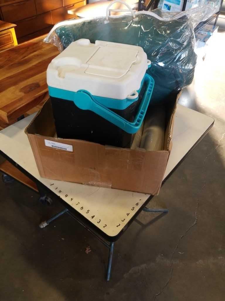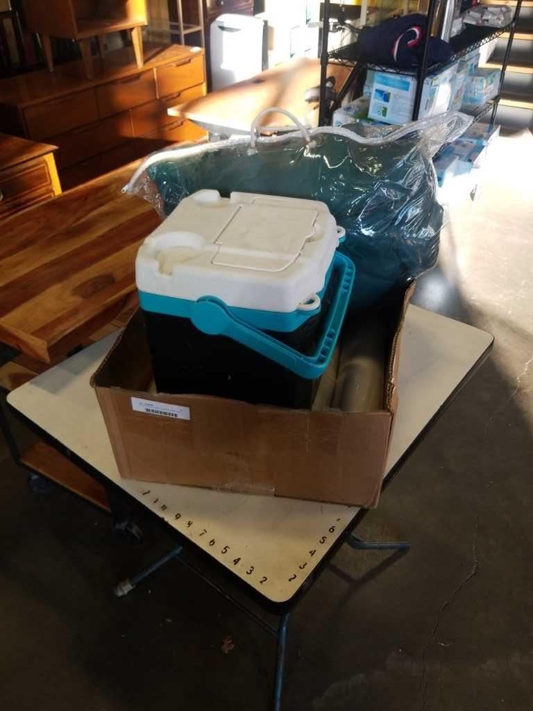 IGLOO COOLER WITH SLEEPING BAG AND NEW SNOW CONE CUPS