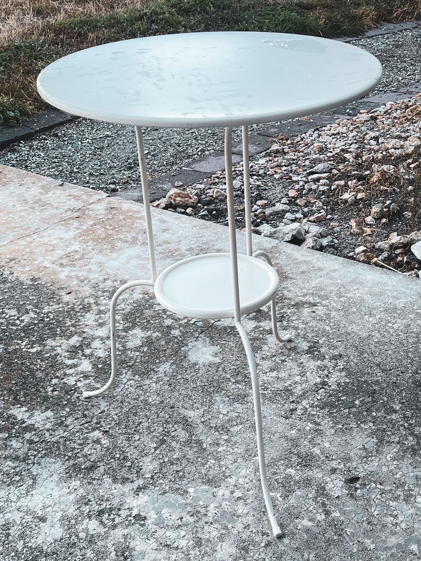 Vintage IKEA Lindved metal side table in white with classic minimalist design and lower shelf detail. Solid and lightweight, ideal as a side table or plant stand. Some minor dings and surface wear on the top, easily refinished. Stylish and functional piece for any modern or cottage space.