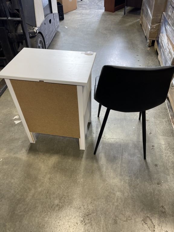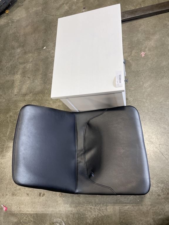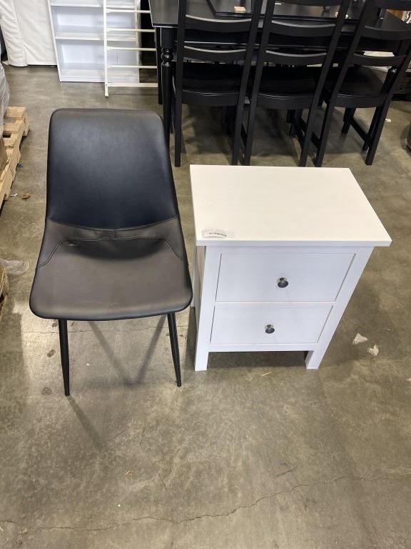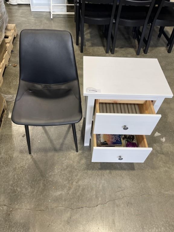 IKEA WHITE 2 DRAWER ENDTABLE AND BLACK LEATHER CHAIR