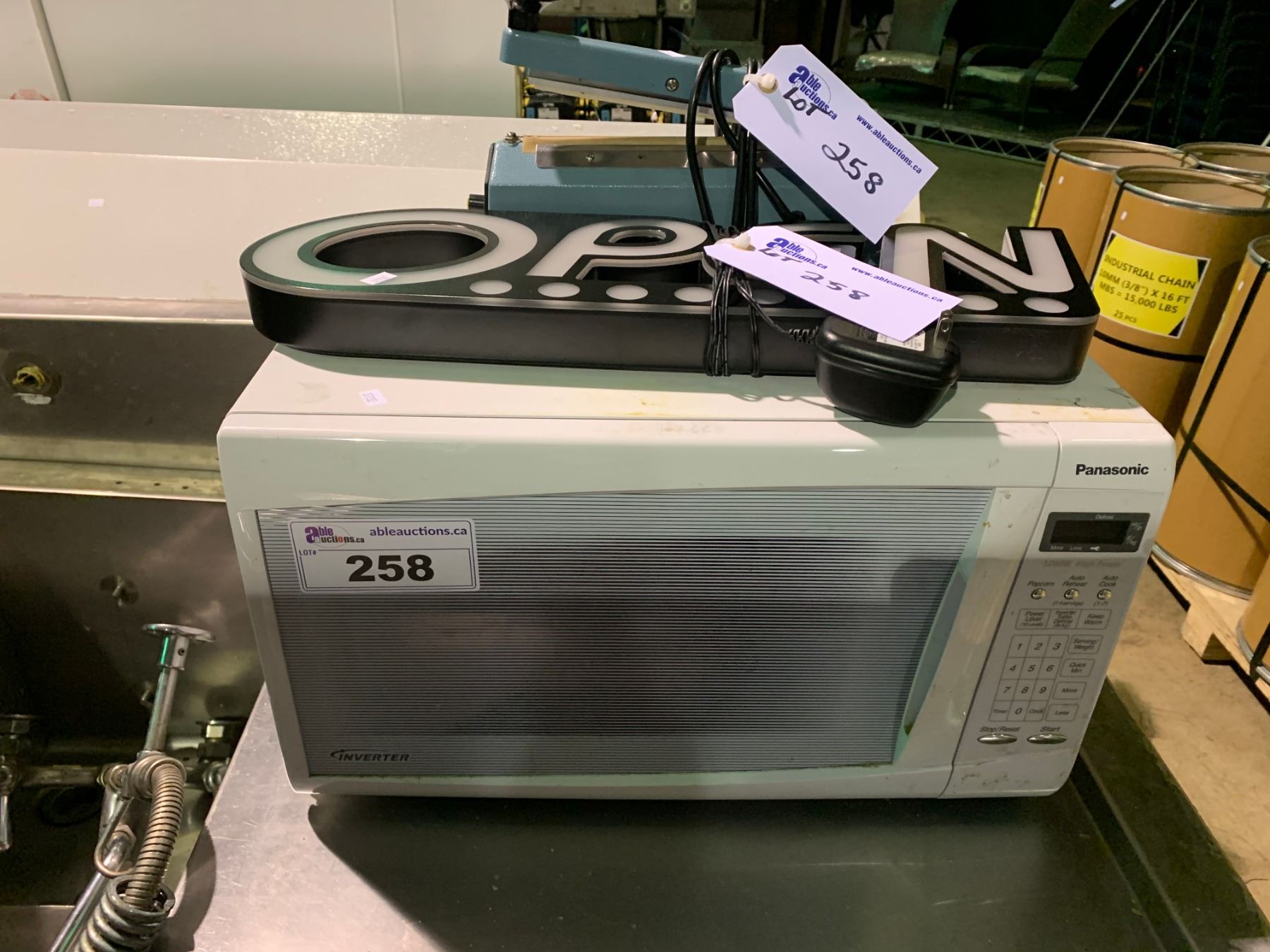 ILLUMINATED OPEN SIGN, HEAT SEALER, PANASONIC MICROWAVE & ASSORTED BINS