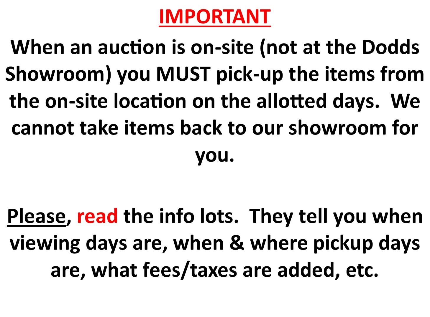 PICK UP FOR LOTS 1607-1716 IS WEDNESDAY (JULY 20) BY APPOINTMENT ONLY AT 7119 GREY CANAL ROAD. THE REST OF THE LOTS ARE TO BE PICKED UP AT THE DODDS SHOWROOM, MON-WED (JULY 18-20), 8:30AM-5PM. IF YOU HAVE ITEMS AT BOTH LOCATIONS, WEDNESDAY IS THE DAY.