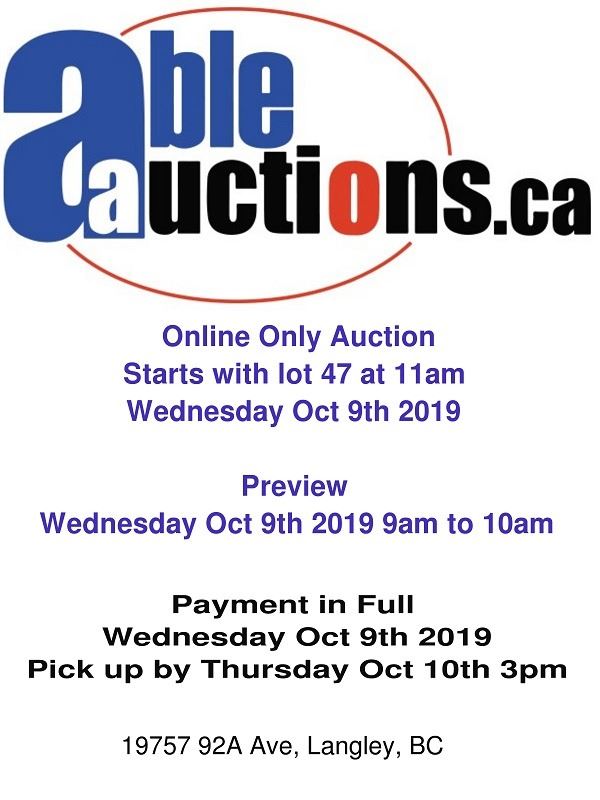 Able Solutions. Inc DBA Ableauctions.ca assumes no responsibility for any liability once a bid is accepted. It is recommended that purchasers arrange insurance for their purchases in advance.