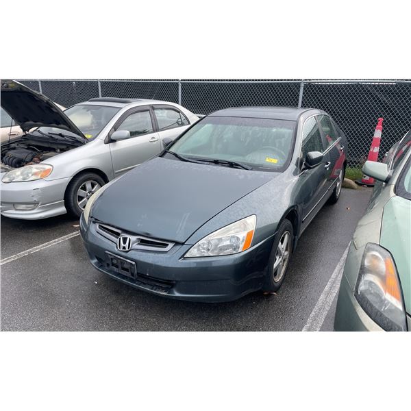 2004 HONDA ACCORD, 4DRSD, GREY, VIN 1HGCM56674A800435, TMU, GAS (G), 2.4L, AUTOMATIC, HAS REGISTRATION, MUST TOW, HAS KEYS, NEEDS JUMP, ODOR PRESENT,