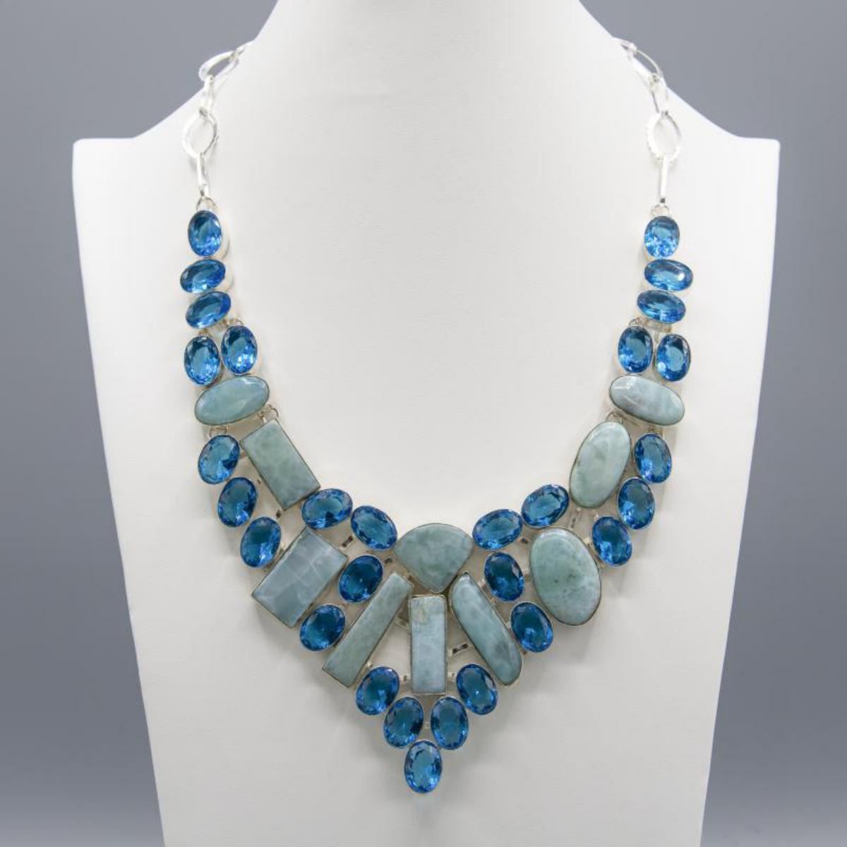 IMPRESSIVE HIGH END 280 CT NATURAL LARIMAR NECKLACE. THESE MINED FROM THE EARTH GEMS ARE HIGHLY POLISHED WITH A FINE BRIGHT LUSTER.MOUNTED IN SOLID .925 STERLING SILVER . ACCENTED WITH FACETED OVAL CUT SKY BLUE TOPAZ GEMSTONES.18 " LONG 624 CTTW OR APROX 125 TOTAL GRAMS.