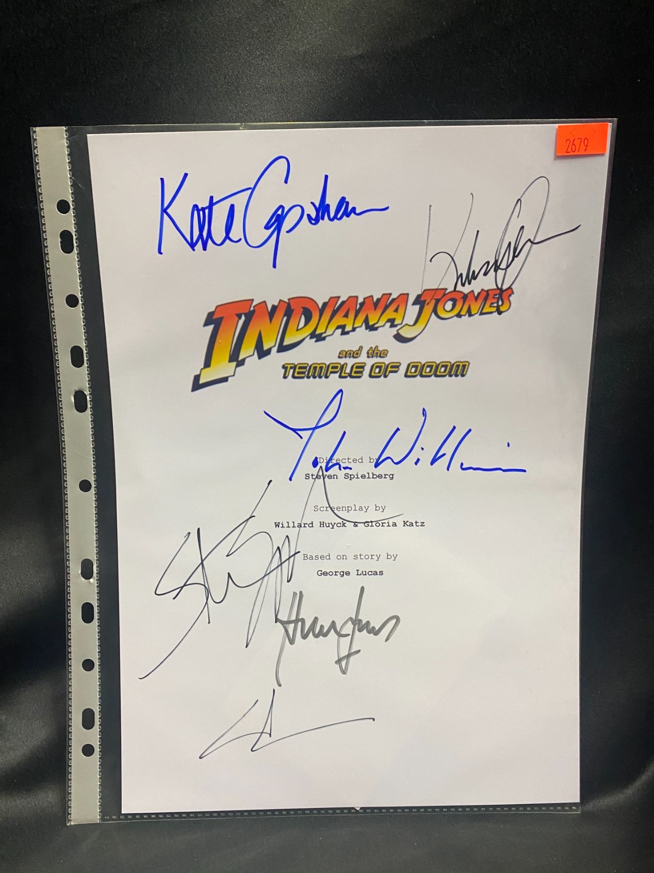 INDIANA JONES AND THE TEMPLE OF DOOM SIGNED SCRIPT COVER WITH COA AUTOGRAPHS INCLUDE: STEVEN SPIELBERG, HARRISON FORD, KATE CAPSHAW, JOHN WILLIAMS, GEORGE LUCAS, KE HUY QUAN