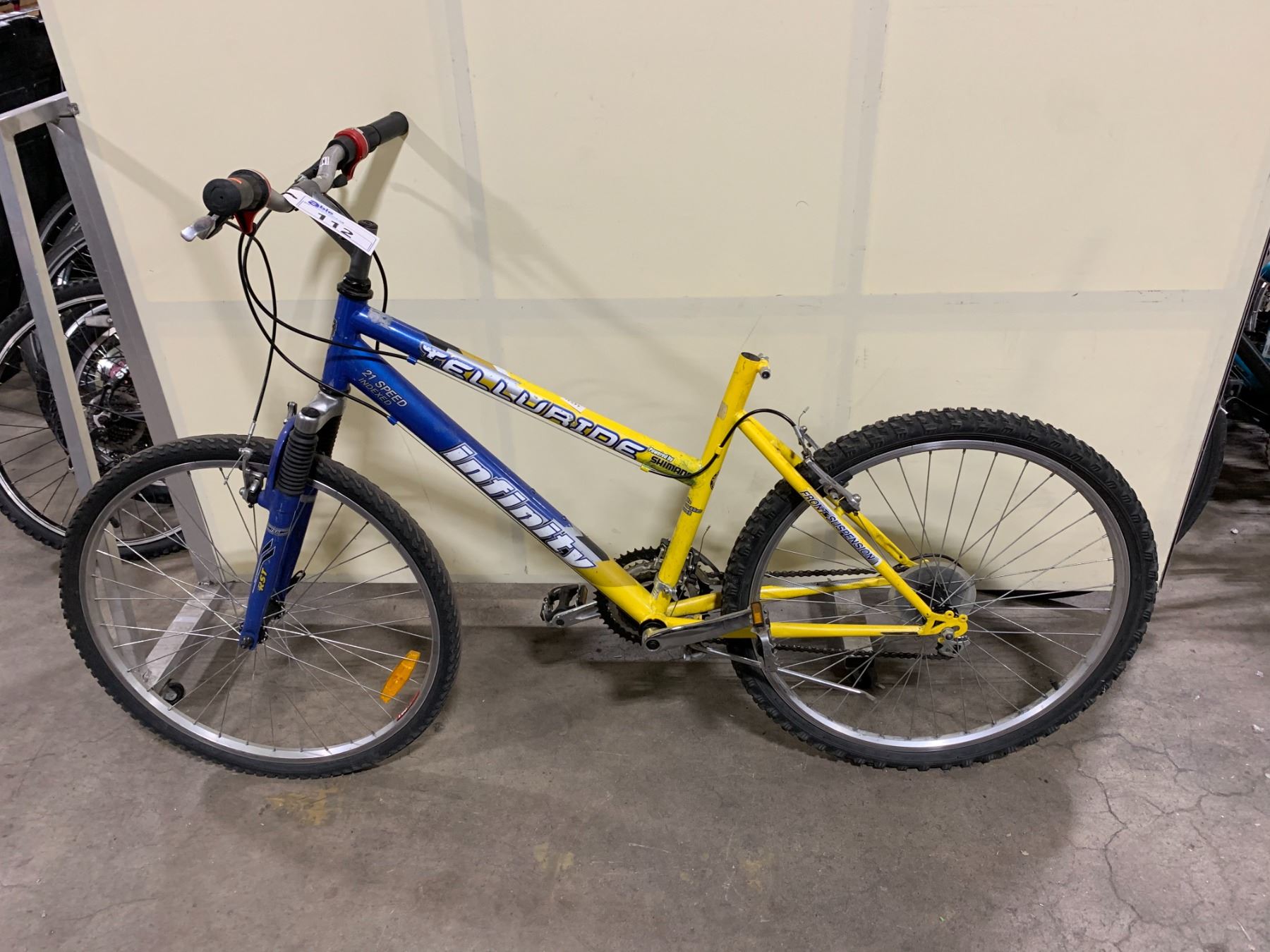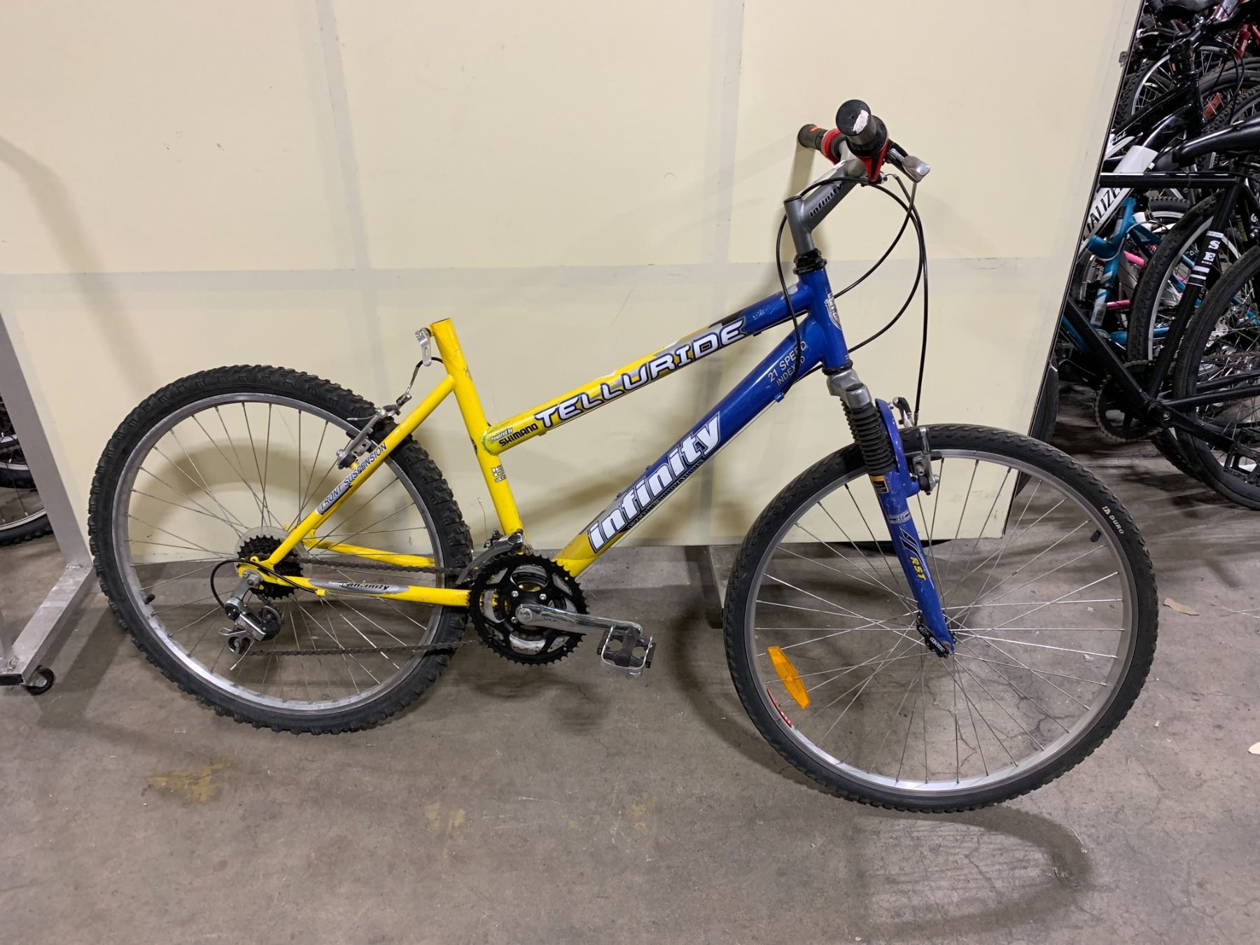 INFINITY TELLURIDE BLUE/YELLOW 21 SPEED FRONT SUSPENSION MOUNTAIN BIKE *NO SEAT*