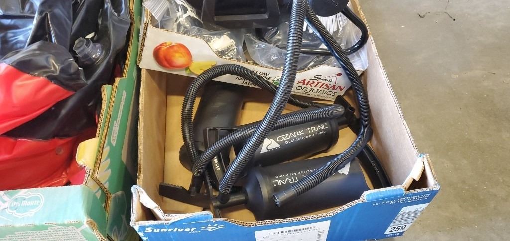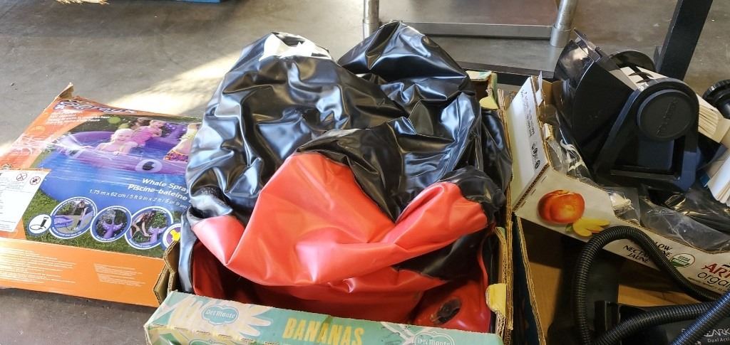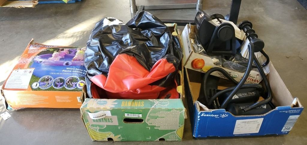 INFLATABLE PUNCHING BAG WITH SAND FILLED BOTTOM, AND WHALE SPRAY KIDS POOL, ASSORTED PUMPS, 2 ROLODEX, CORDLESS PHONE ETC