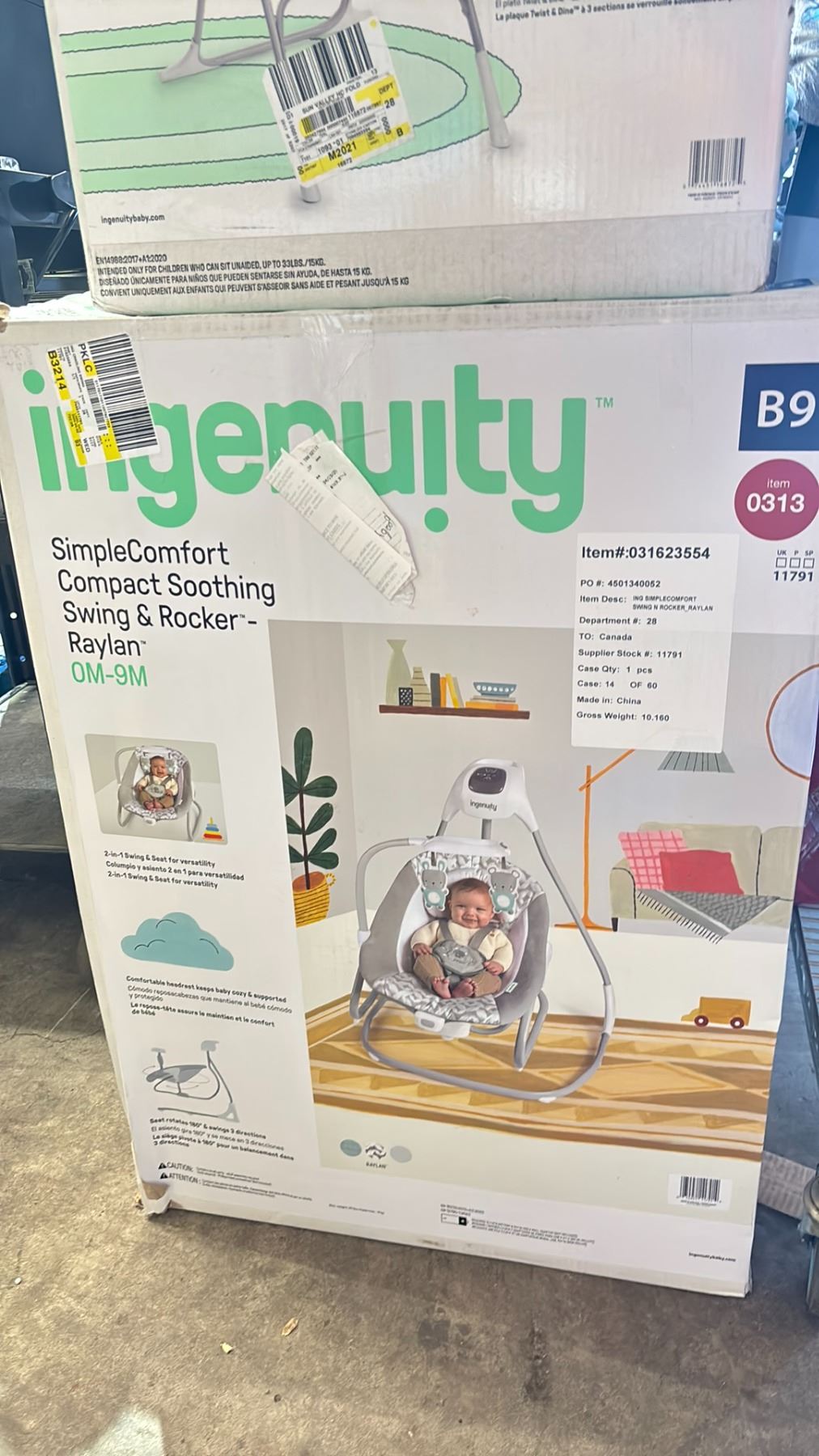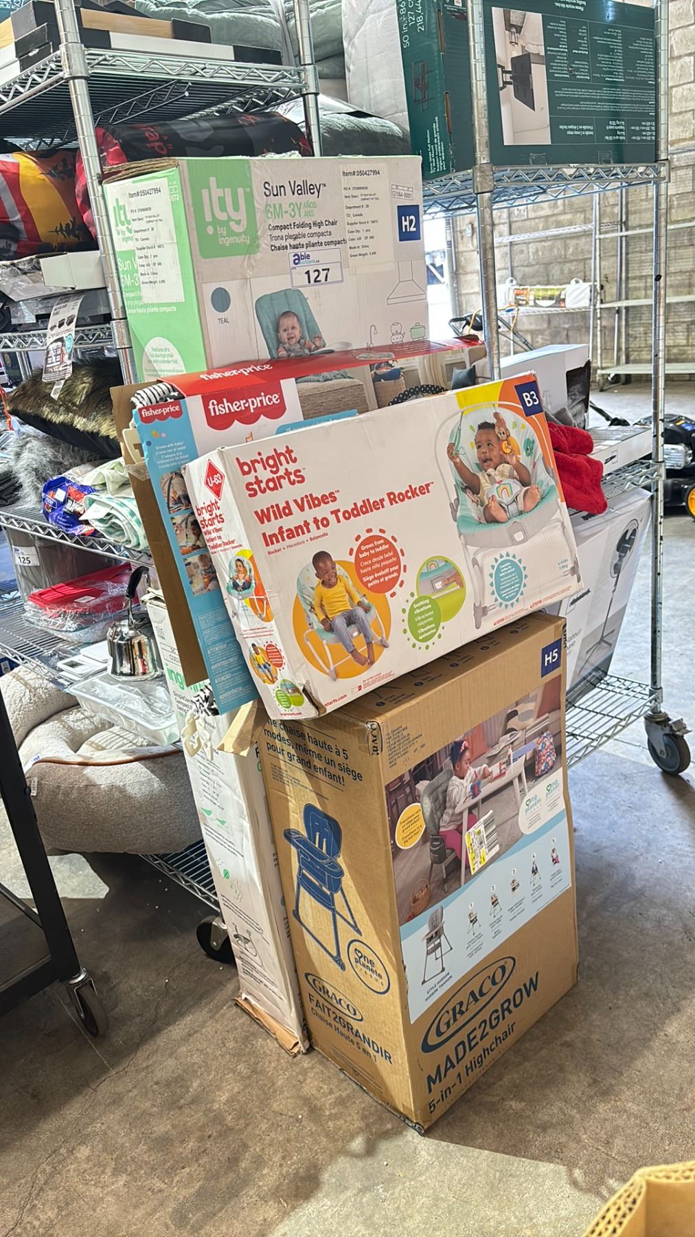 INGENUITY SIMPLE COMFORT COMPACT SOOTHING SWING & ROCKER ( 0M - 9M ), INGENUITY COMPACT FOLDING HIGH CHAIR ( 6M - 3Y ), GRACO MADE2GROW 5-IN-1 HIGHCHAIR, FISHER PRICE 3-IN-1 GLOW & GROW GYM & A BRIGHT STARS WILD VIBES INFANT TO TODDLER ROCKER *WORKING CONDITION UNKNOWN/MAY BE MISSING PARTS AND/OR PIECES*