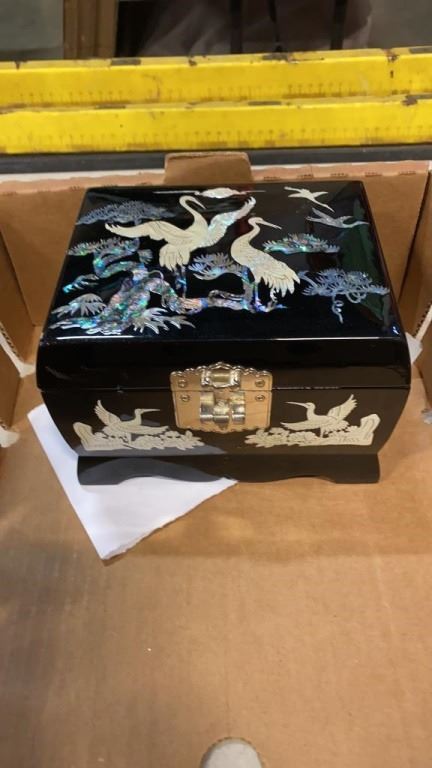 INLAYED JEWELRY BOX WITH VINTAGE WEATHER GUAGE AND ELVIS PRINT