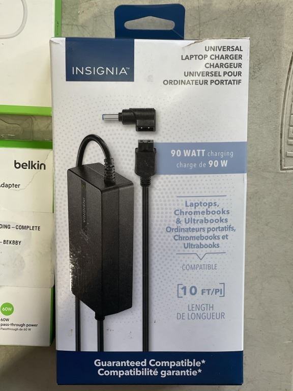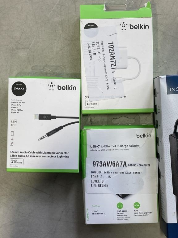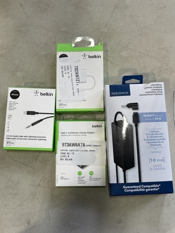 INSIGNIA 90 WATT UNIVERSAL LAPTOP CHARGER, BELKIN USB-C TO ETHERNET CHARGE ADAPTOR, AUDIO CABLE TO LIGHTNING, AND AUDIO AND CHARGE ROCKSTAR CABLE