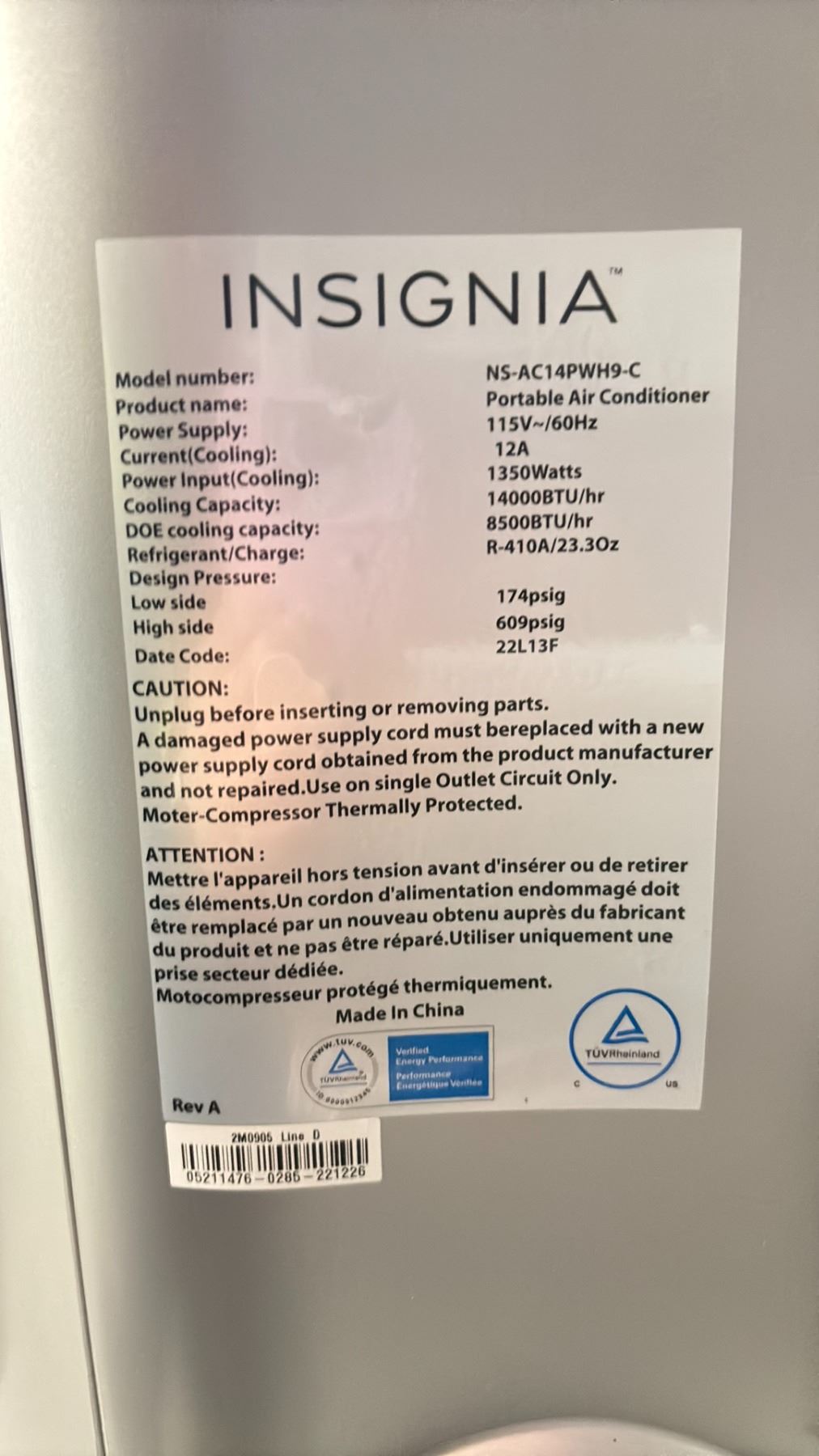 INSIGNIA AIR CONDITIONER **AIR CONDITIONER ONLY/WORKING CONDITION UNKNOWN**