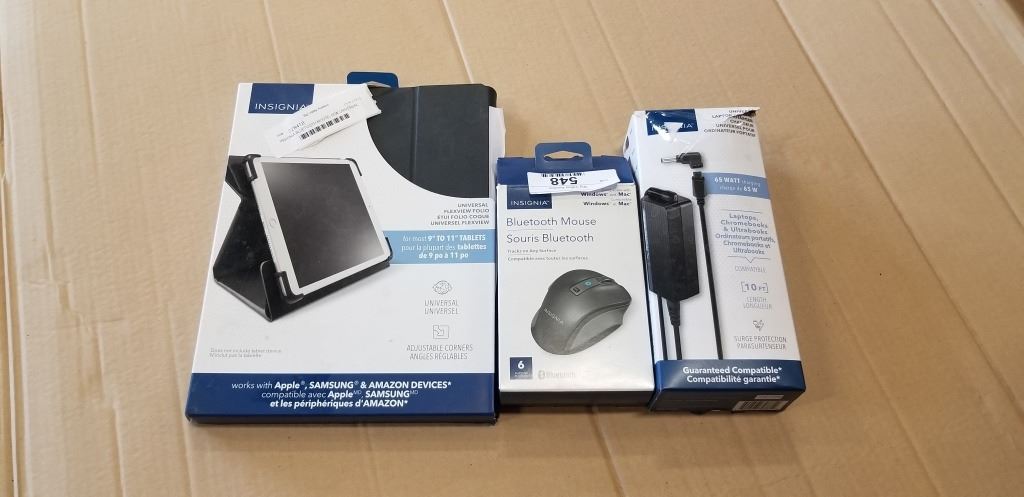 INSIGNIA BLUETOOTH MOUSE, 65W UNIVERSAL LAPTOP CHARGER AND FLEXVIEW FOLIO