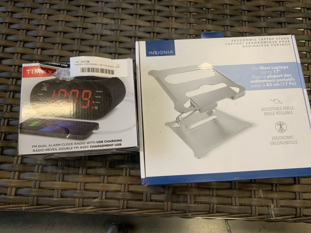 INSIGNIA ERGONOMIC LAPTOP STAND, AND TIMEX FM DUAL ALARM CLOCK RADIO WITH WITH USB CHARGING
