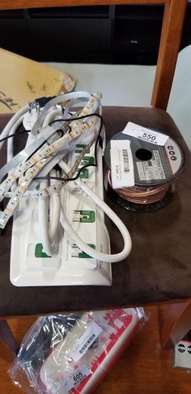 INSIGNIA POWER SURGE PROTECTION POWER BAR, ROCKETFISH 30FT SPEAKER CABLE AND LED LIGHT STRIP