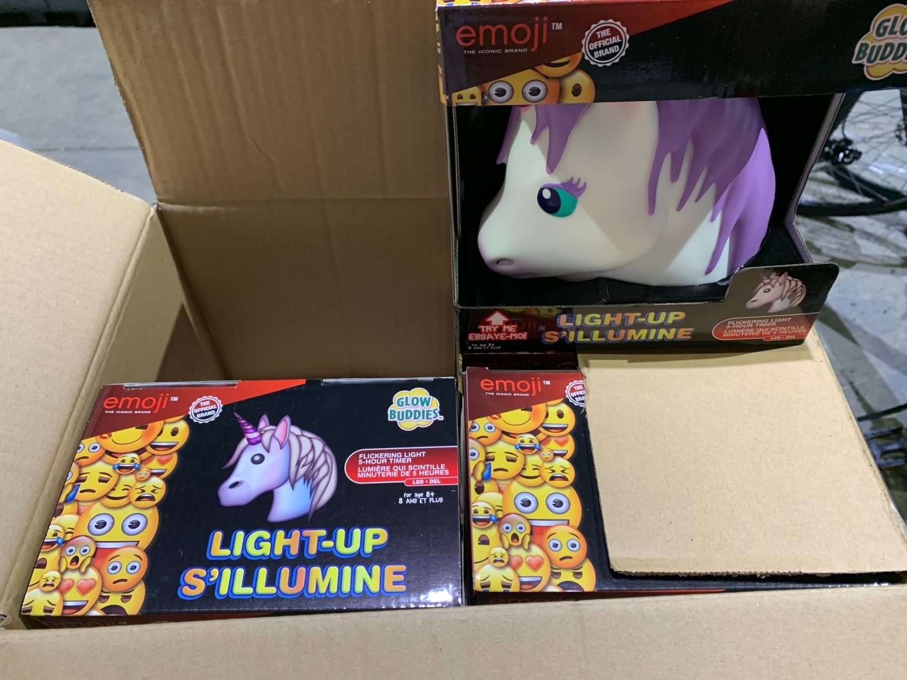 INSIGNIA TRIPOD, BOX OF ASSORTED ELECTRONICS, BOX OF DINOSAUR TOYS, AND 2 BOXES OF UNICORN GLOW LIGHTS