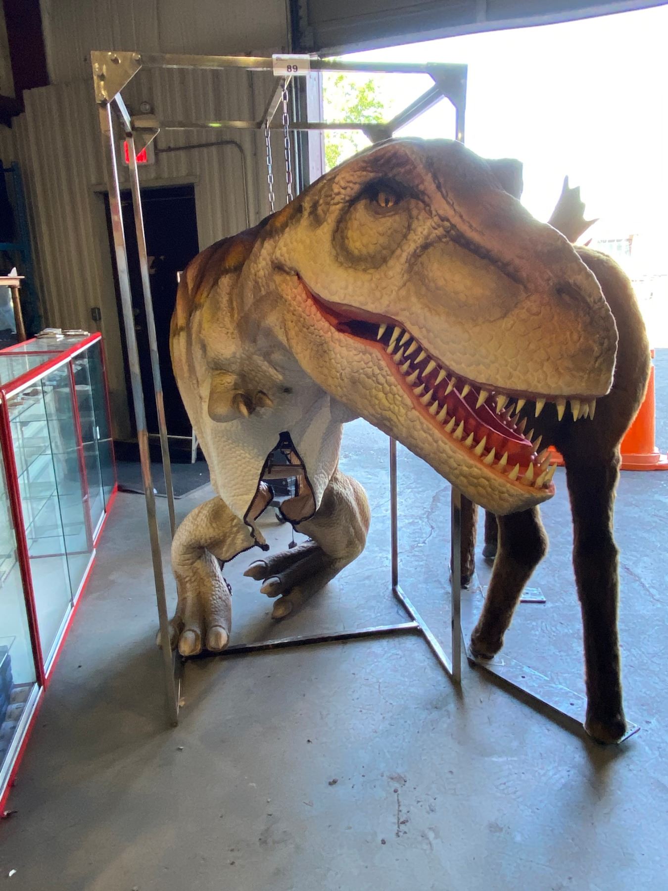 INTERACTIVE JUVENILE TYRANNOSAURUS REX CRETATIOUS PERIOD DINOSAUR COSTUME MEASURES 196" LONG X 41" WIDE X 80" TALL. APPROX WEIGHT 75 KG C/W CUSTOM DRESSING STAND, VIDEO CAMERA & MONITOR FOR OPERATOR VISIBILITY & CHARGER READY FOR SHIPPING APPROX 450LBS