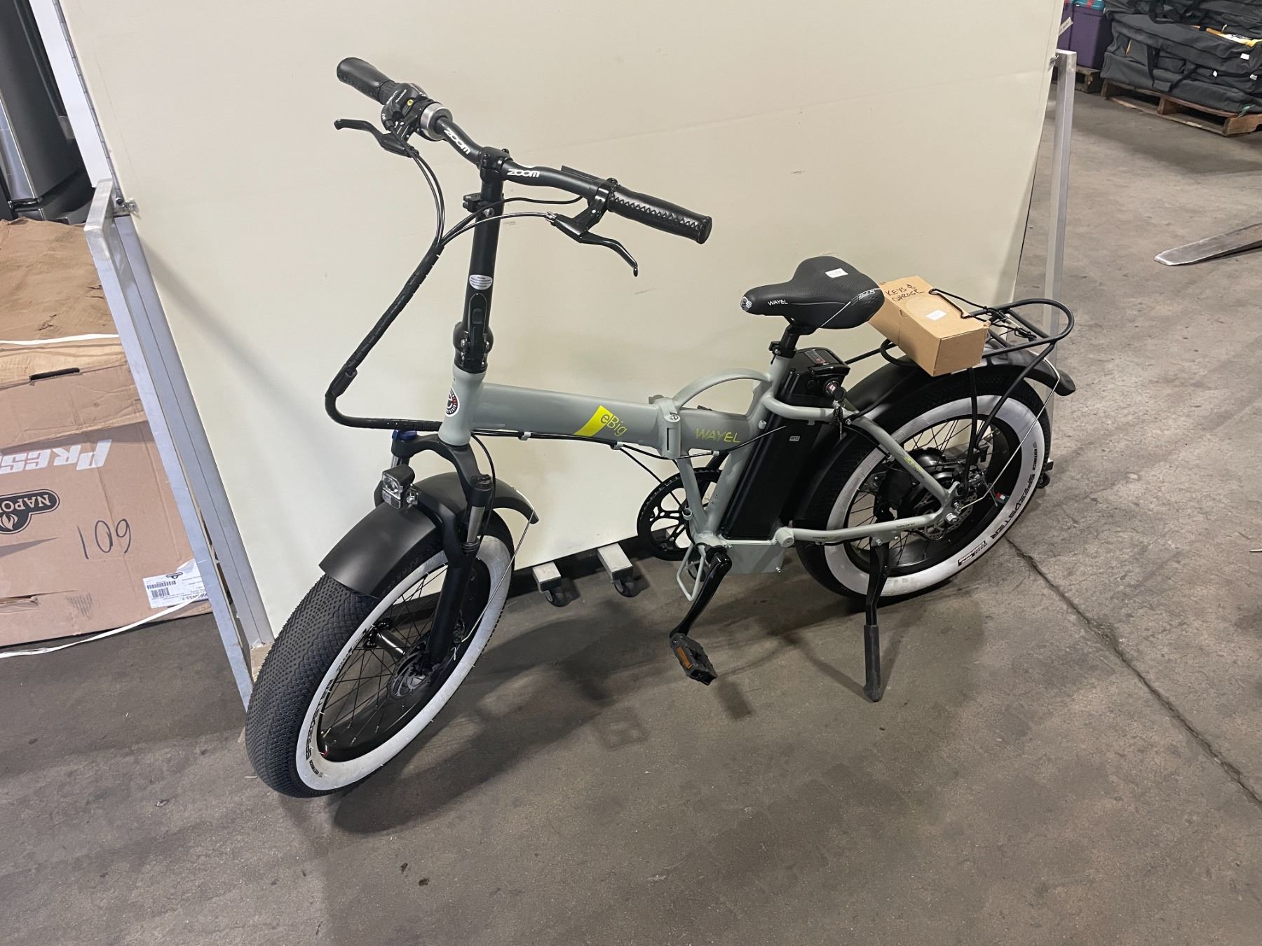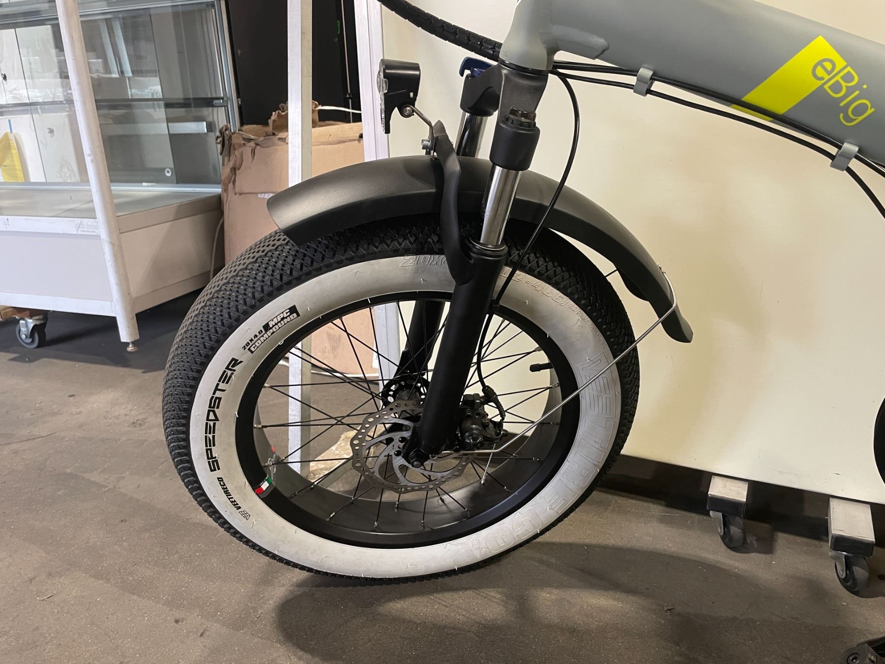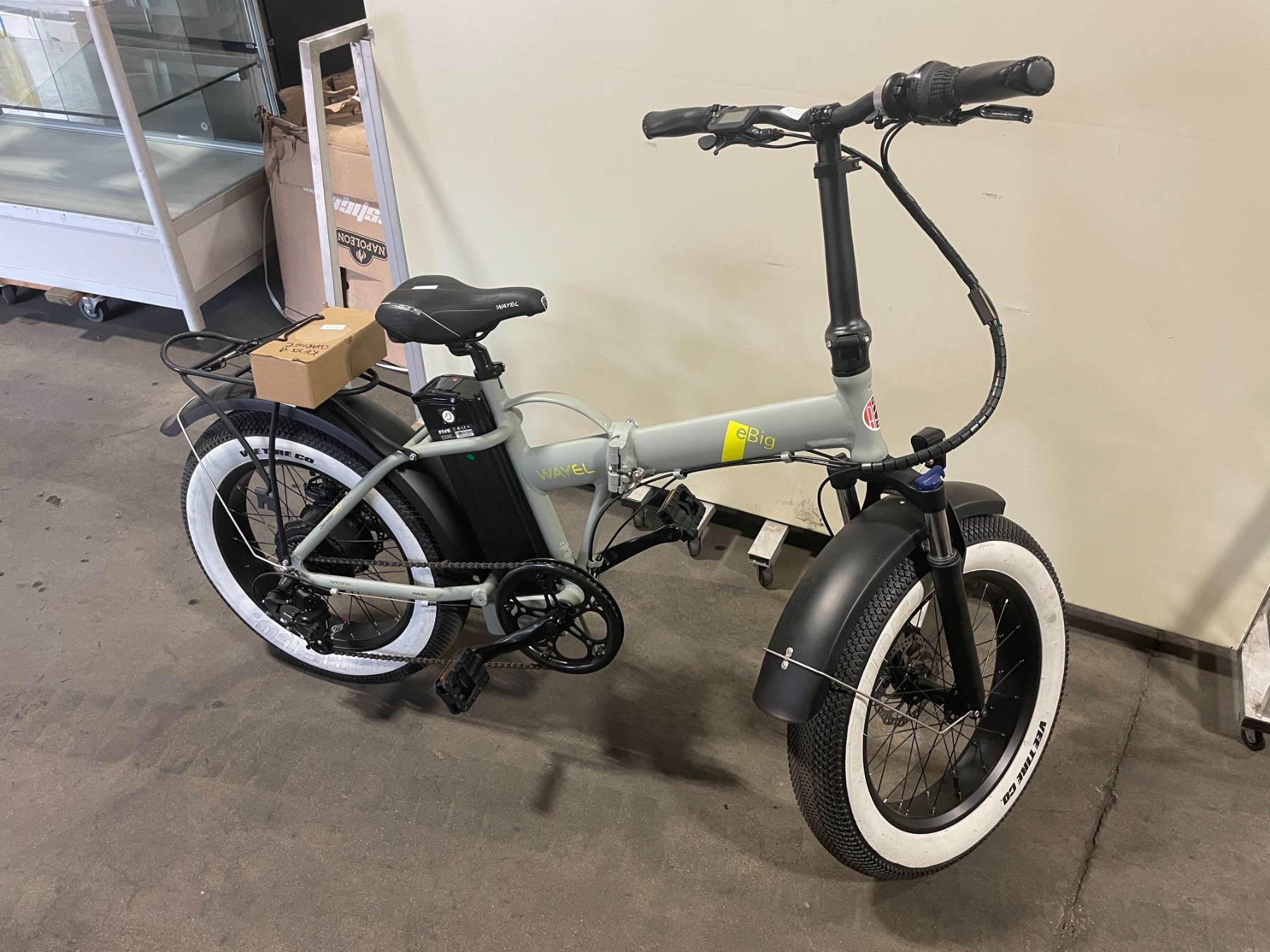 ITALWIN EBIG FOLDABLE FRONT SUSPENSION MOUNTAIN E-BIKE. 500W/1000W MOTOR, 32 KM/H MAX SPEED, 36 VOLT BATTERY, DISPLAY MONITOR, 4" X 20" TIRES, UP TO 75 KM RANGE, MECHANICAL DISC BRAKES, 16.5" X 22.8" FRAME, LED LIGHTING, 26 KG WEIGHT, FULL THROTTLE & PEDAL ASSISTED, HAS LUGGAGE RACK, KEYS & CHARGER (UNASSEMBLED/IN BOX)