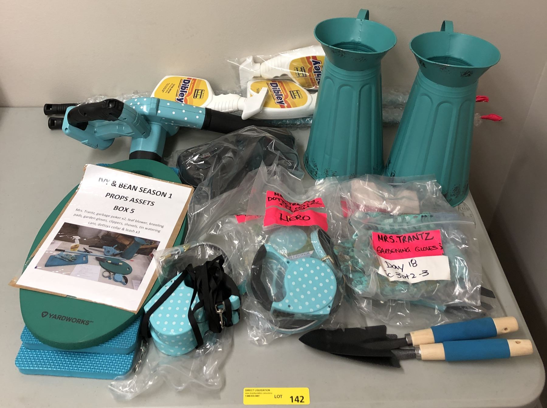 "IVY+Bean Movie" Mrs. Trnatz contents - includes gardening gloves/ shovels / Dottsy collar + leash garbage poker / leaf blower/ tin watering cans etc.