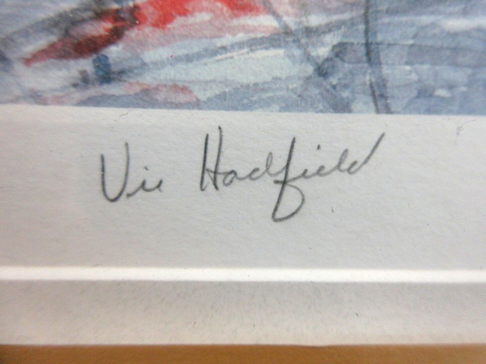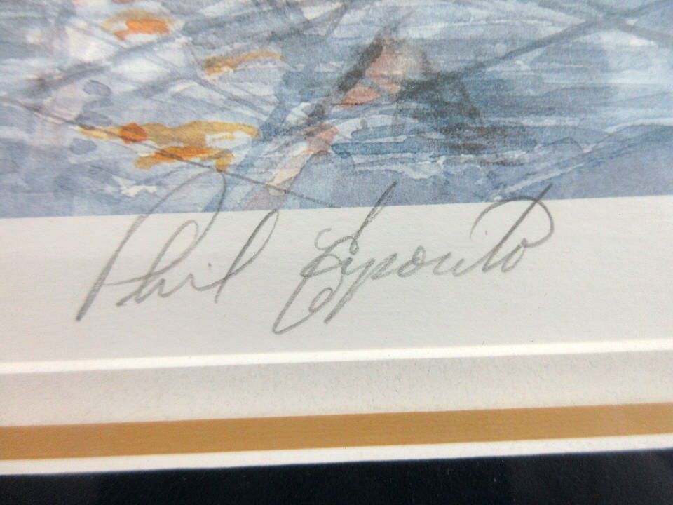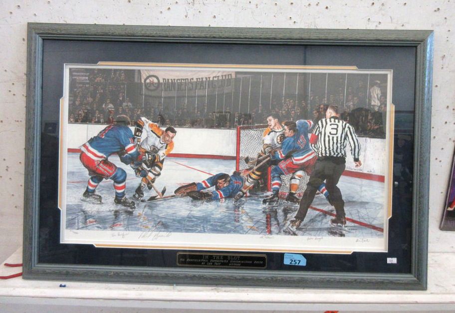 Certification stamp on print. #417/2000. Autographed by Vic Hadfield, Phil Esposito, Ed Giacomin, and John Bucyk. Also signed by the artist Les Tait. 37" x 24" framed.
