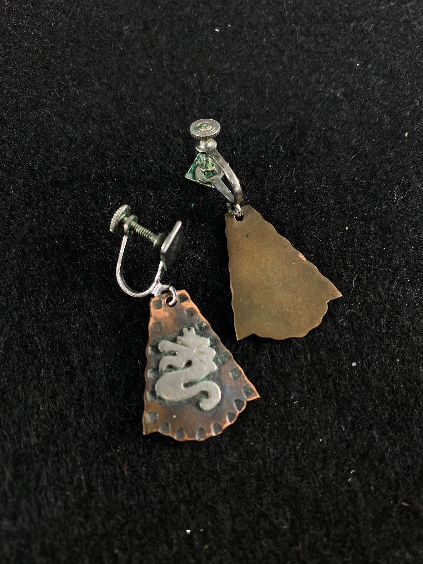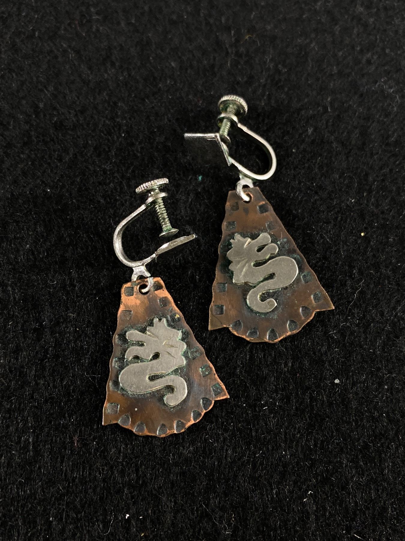 Interesting Vintage 1940's Copper & Silver Dragon Earrings