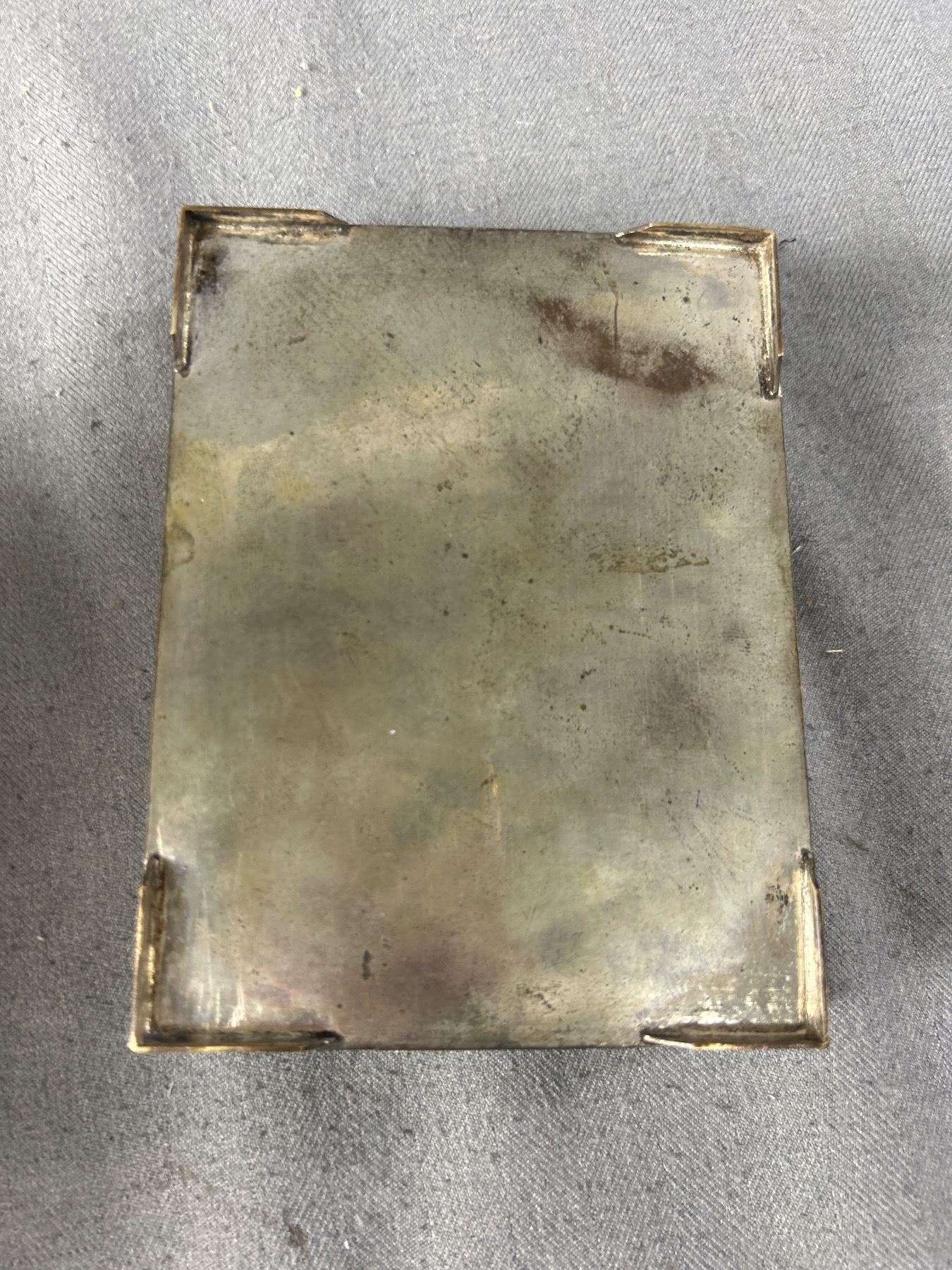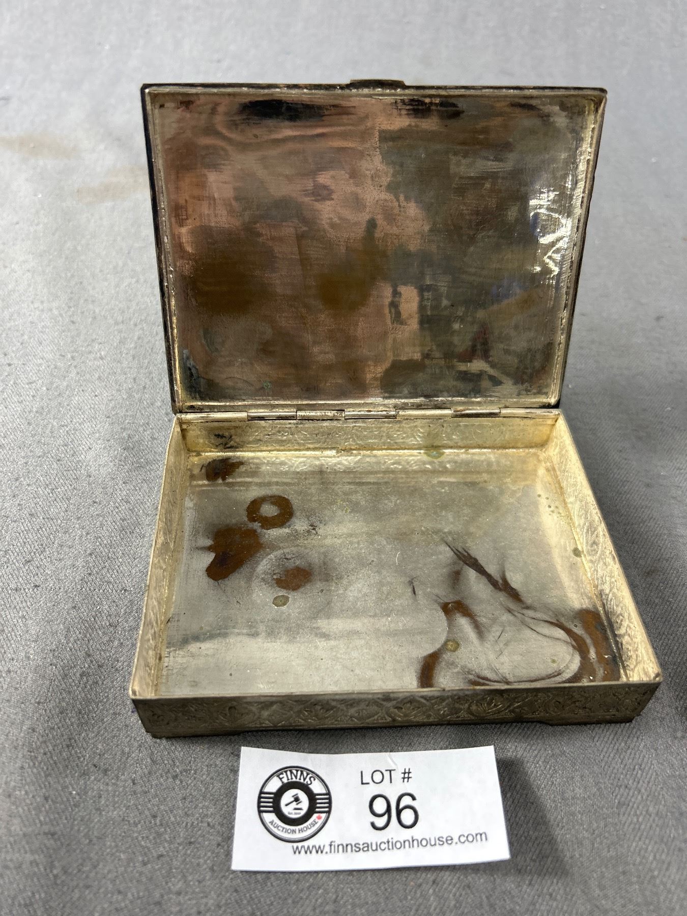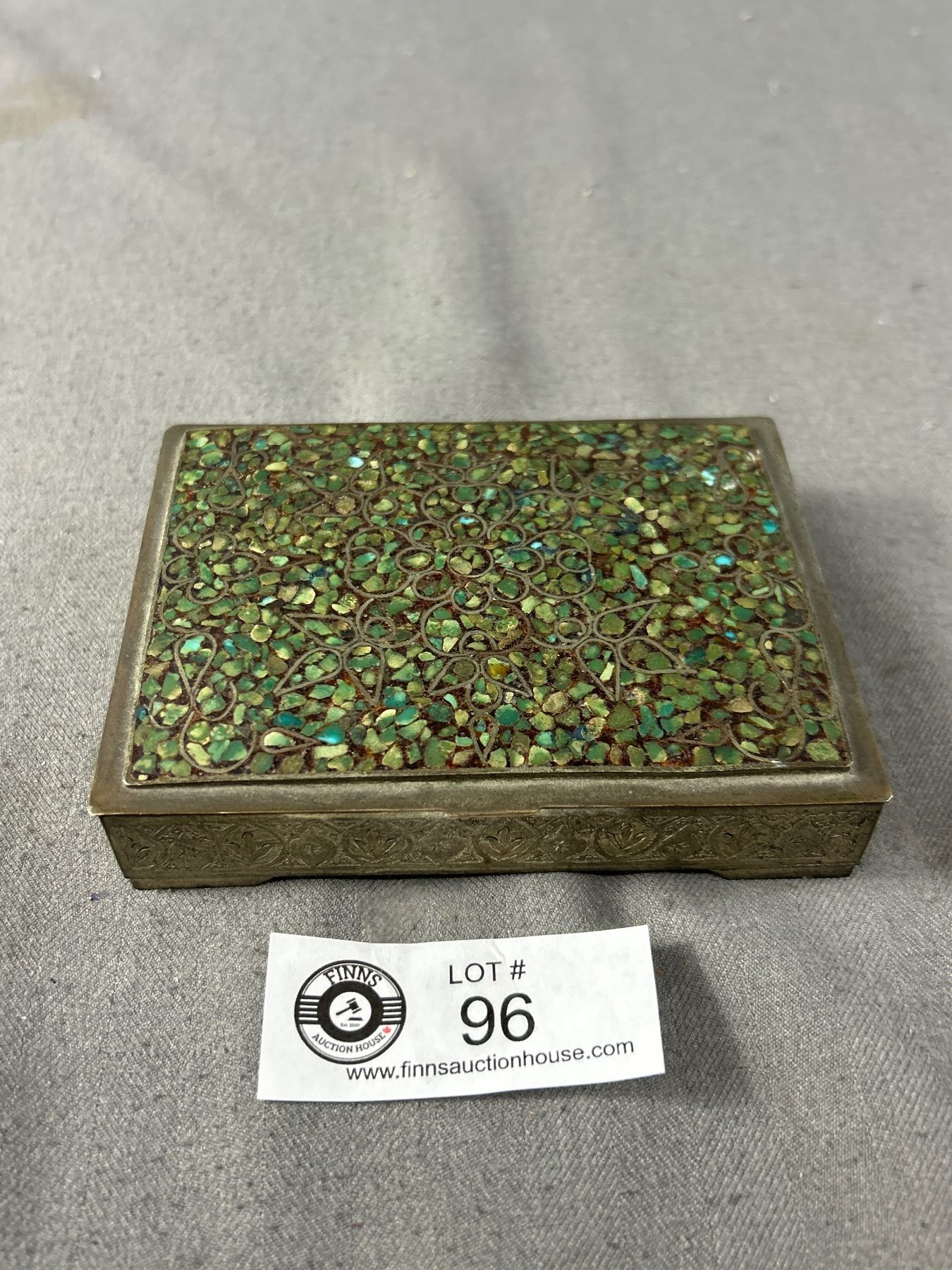 Interesting Vintage Metal Trinket Hinged Lid Box w/ Confetti Turquoise Inlaid. Approx. 5" x 4" x 1"