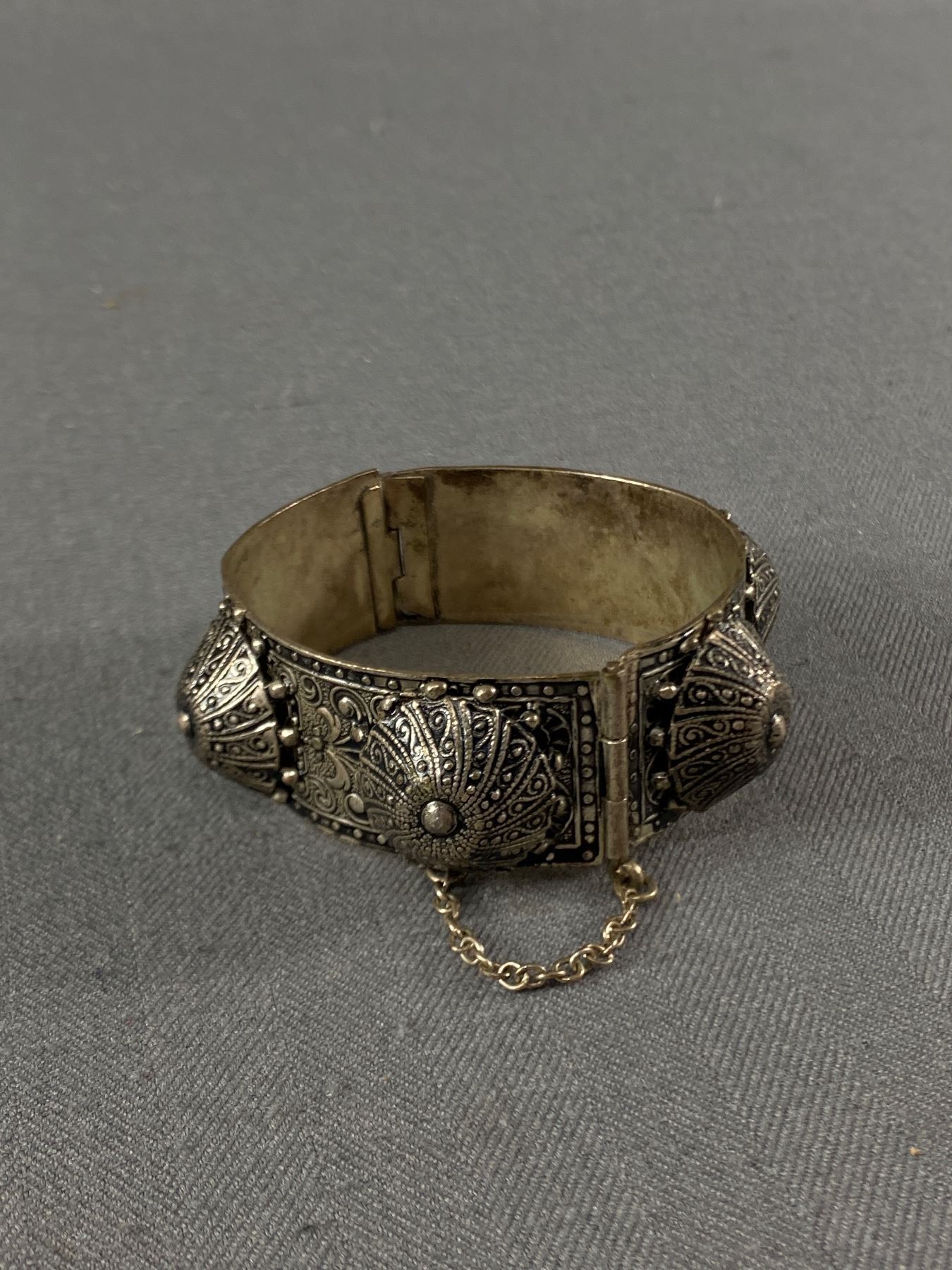 Interesting Vintage Middle Eastern Metal Cuffed Bracelet w/ Locking Pin