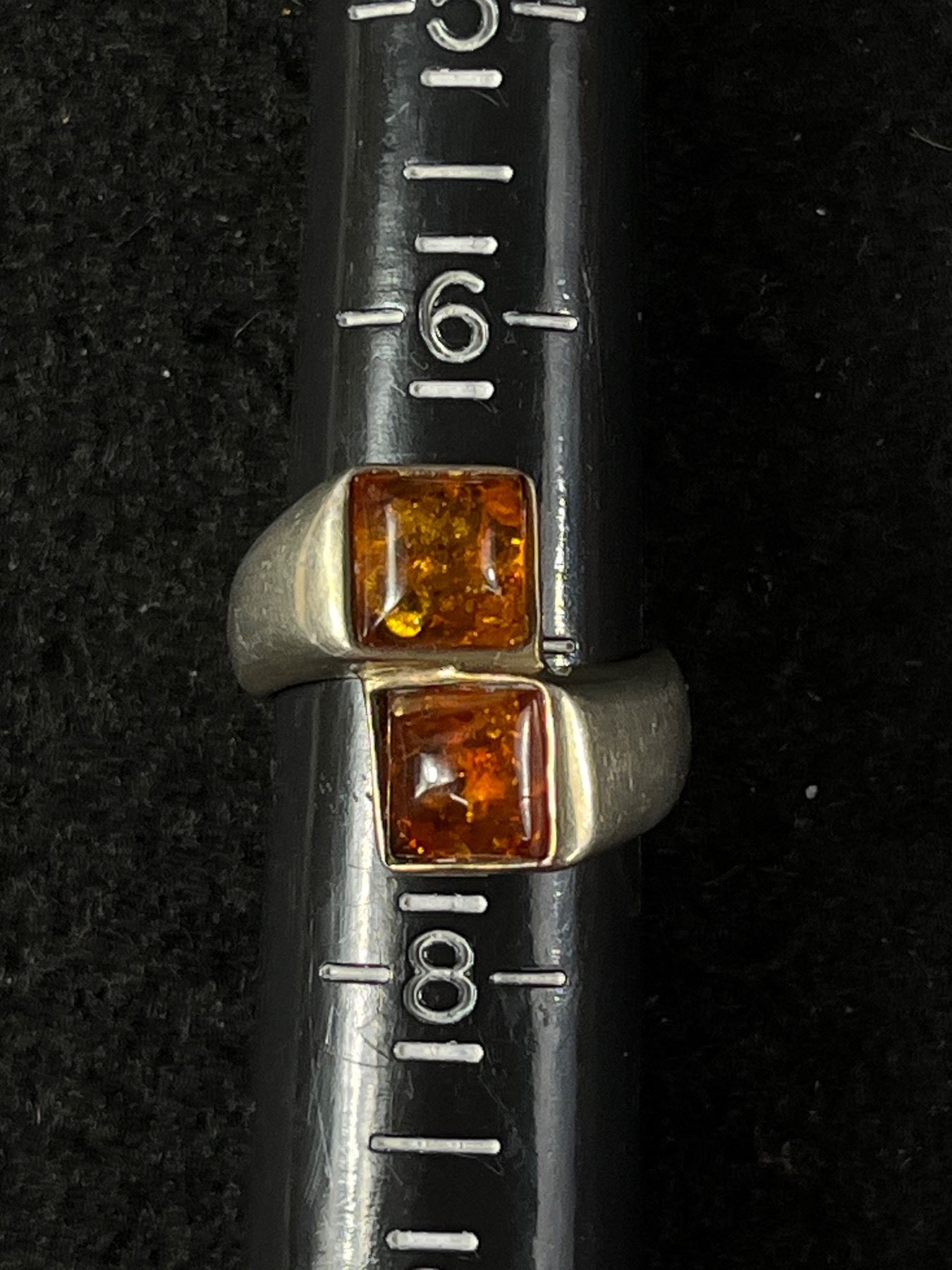 Interesting Vintage Silver Ring with 2 Amber Stones. Size 7