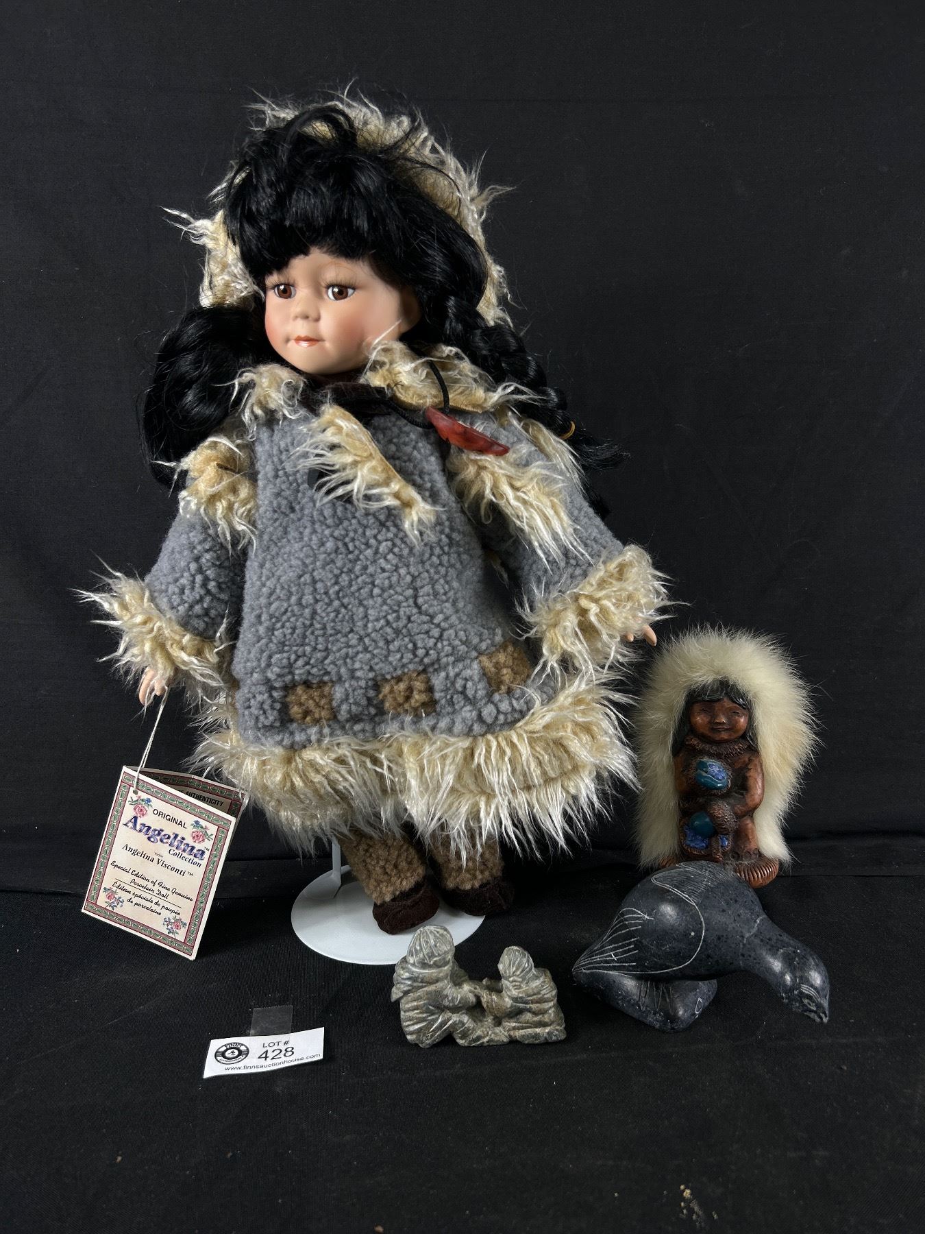 Inuit Décor - 15" Porcelain Doll On Stand, Figurine & 2 Carved Stone Figures (1 is Signed)