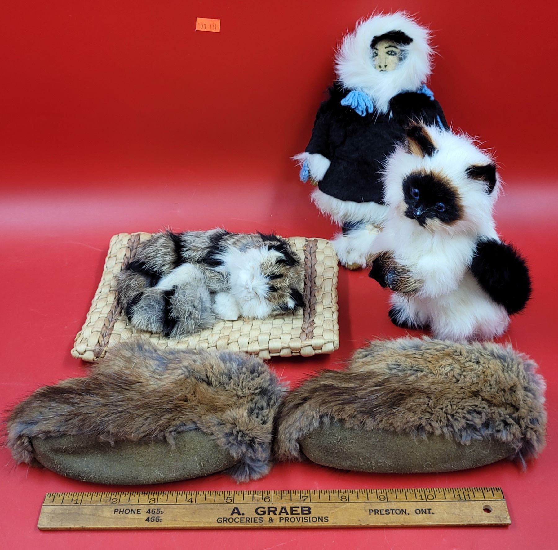Inuit Doll, Fur Moccasins & Two Fur Cats