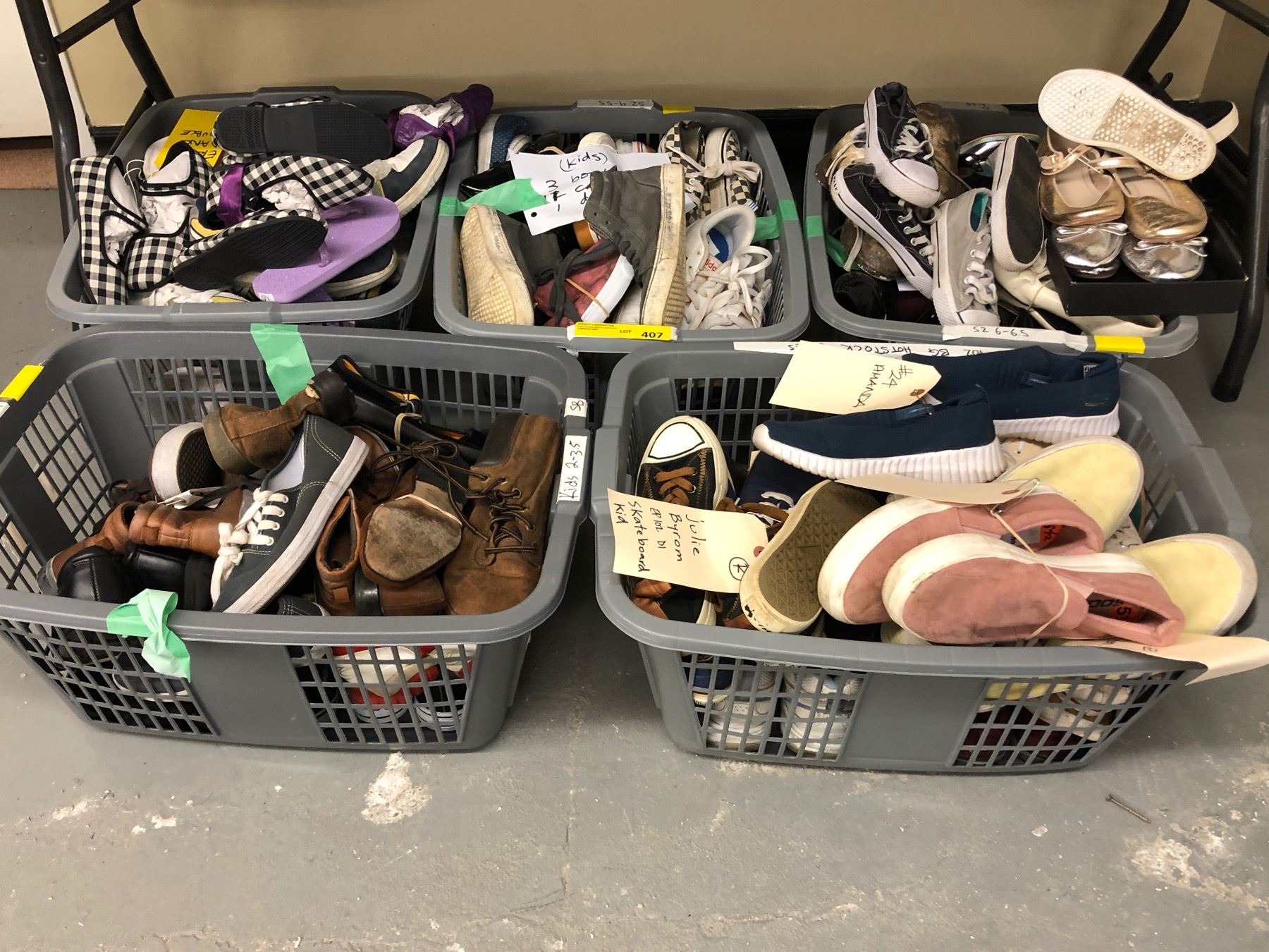 "Ivy + Bean Movie" 5 baskets full of kids' assorted shoes - includes Converse sneakers/ boots/ ballet slippers/ joggers etc.
