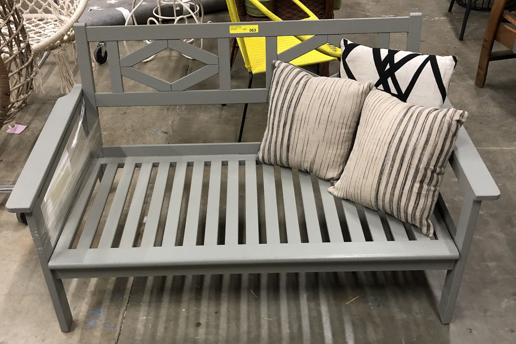 "Ivy + Bean Movie" - Trantz's yard - patio wooden bench with cushions ( Approx. 54 1/2 inches wide by 28 1/2 inches depth by 29 inches high