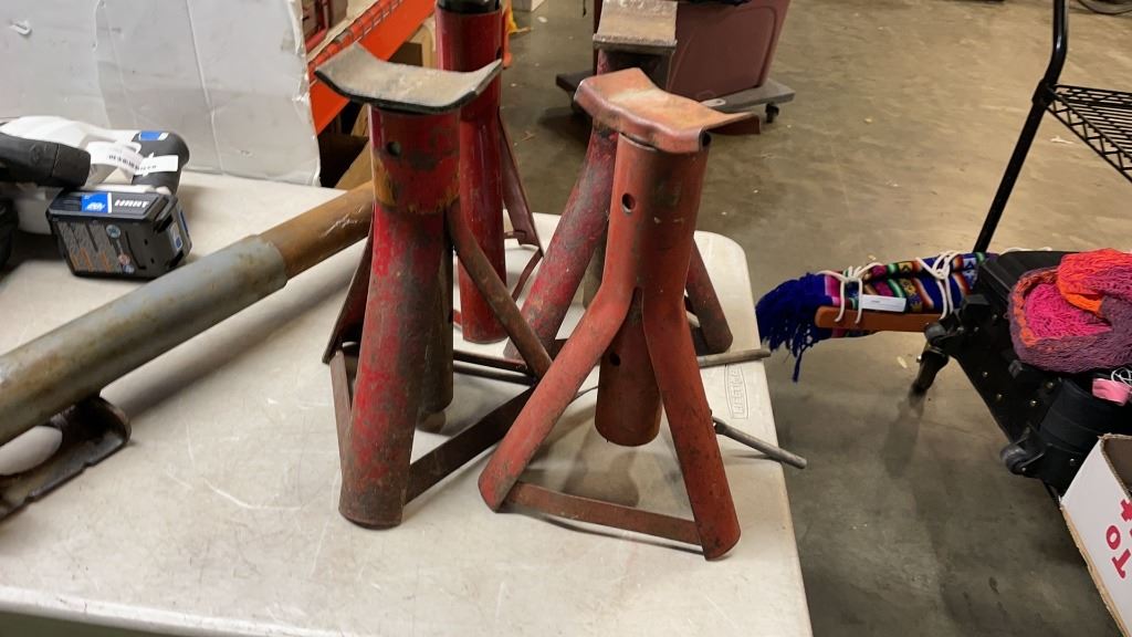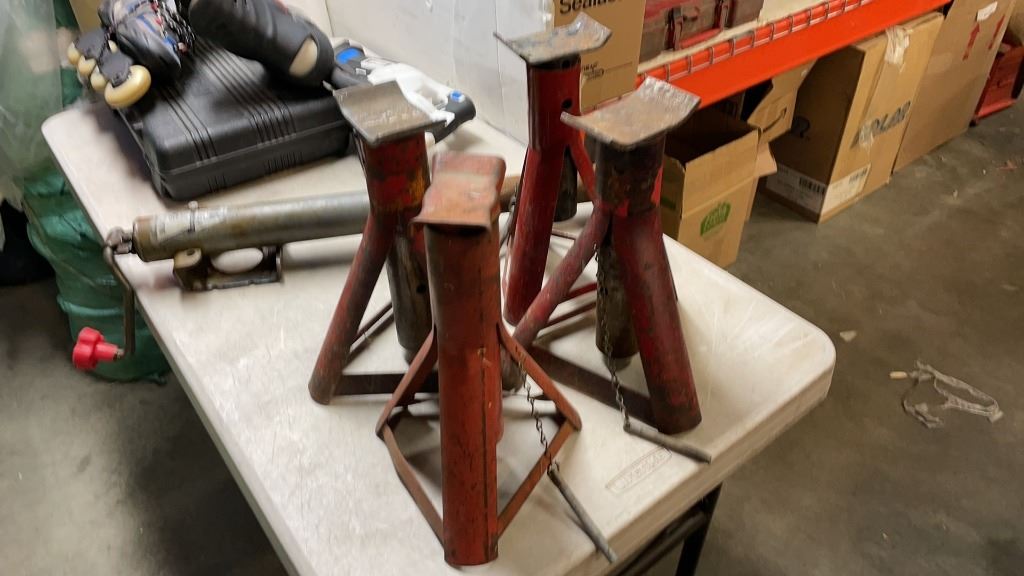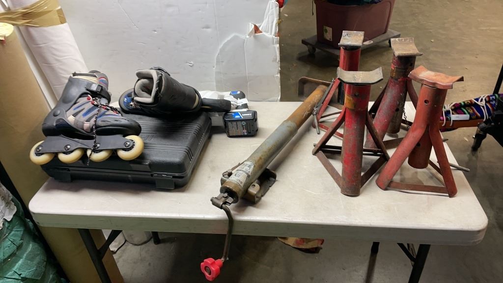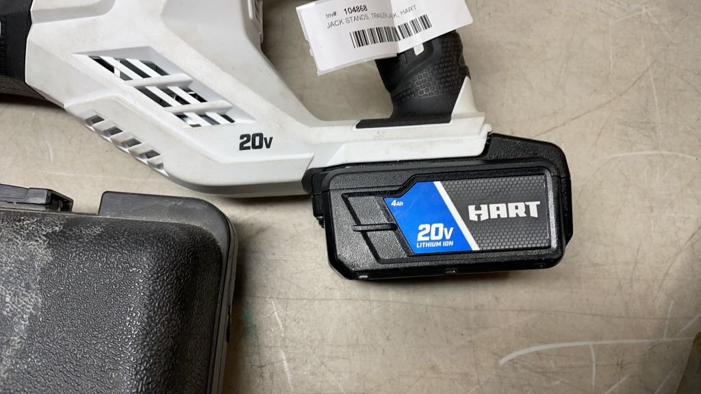 JACK STANDS, TRAILER JACK, HART CORDLESS SAWZALL AND CORDLESS DRILL