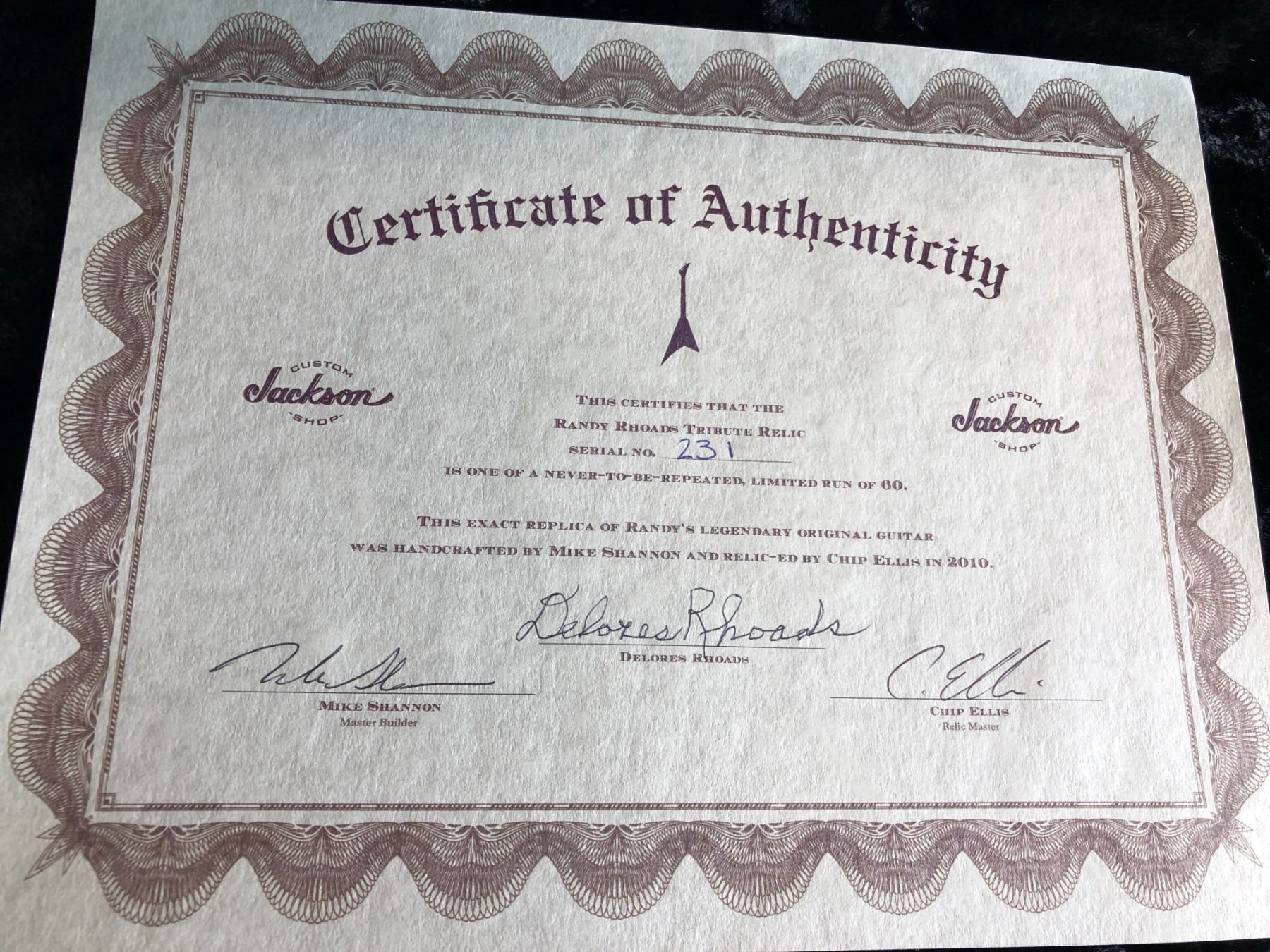 JACKSON HIGH FLYER RANDY RHOADES TRIBUTE RELIC SN#231 LIMITED RUN OF 60, CONCORDE SERIES 6 STRING ELECTRIC GUITAR WITH FULL DOCUMENTATION LIST PRICE $12,619.56 REFLECTING REFLECTING RANDY RHOADES BIRTHDAY 12/6/1956 IS REPLICA GUITAR FROM BLIZZARD OF OZ TOUR