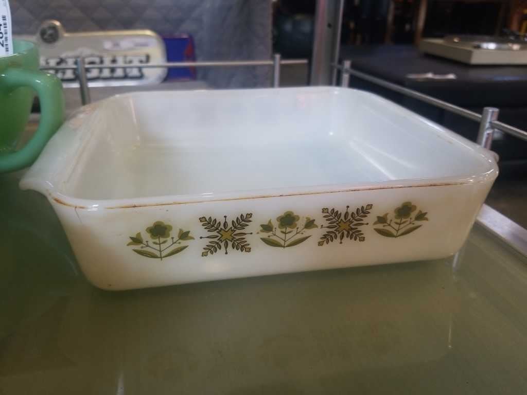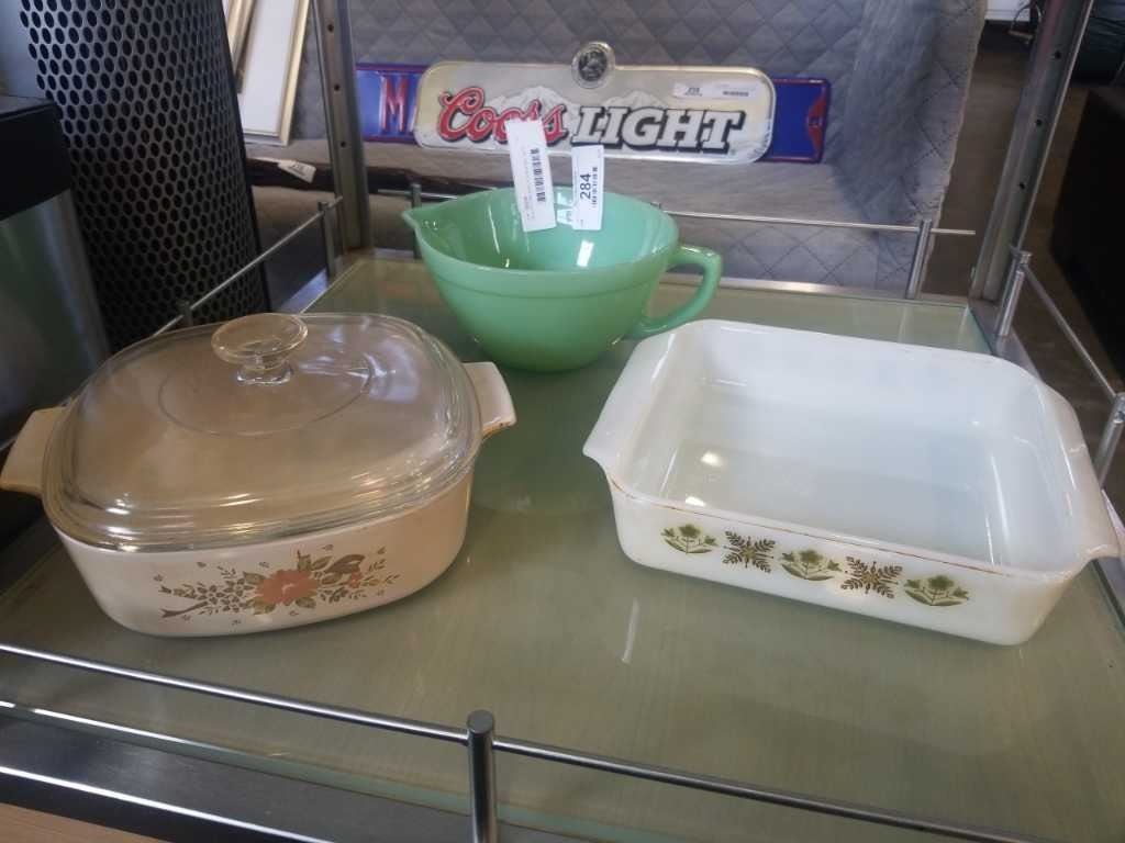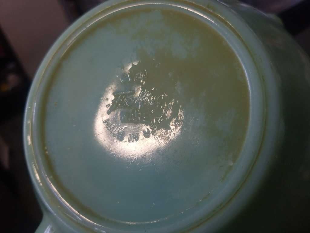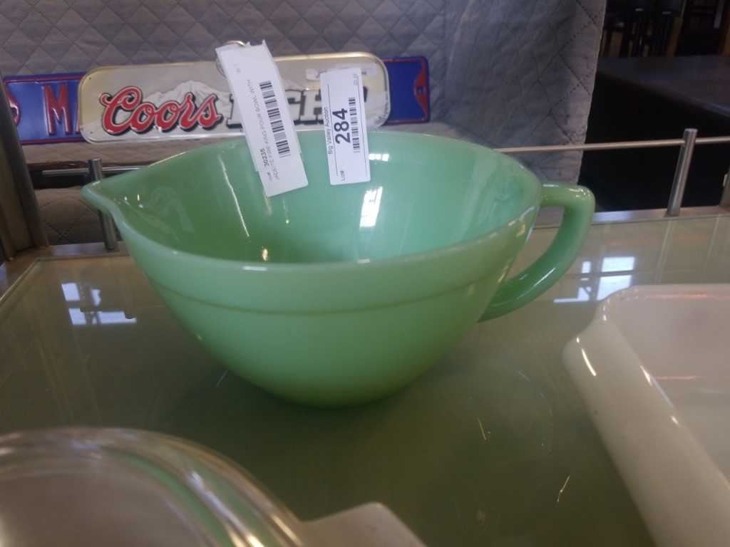 JADEITE FIRE KING POUR BOWL WITH PYREX POT AND FIRE KING BOWL