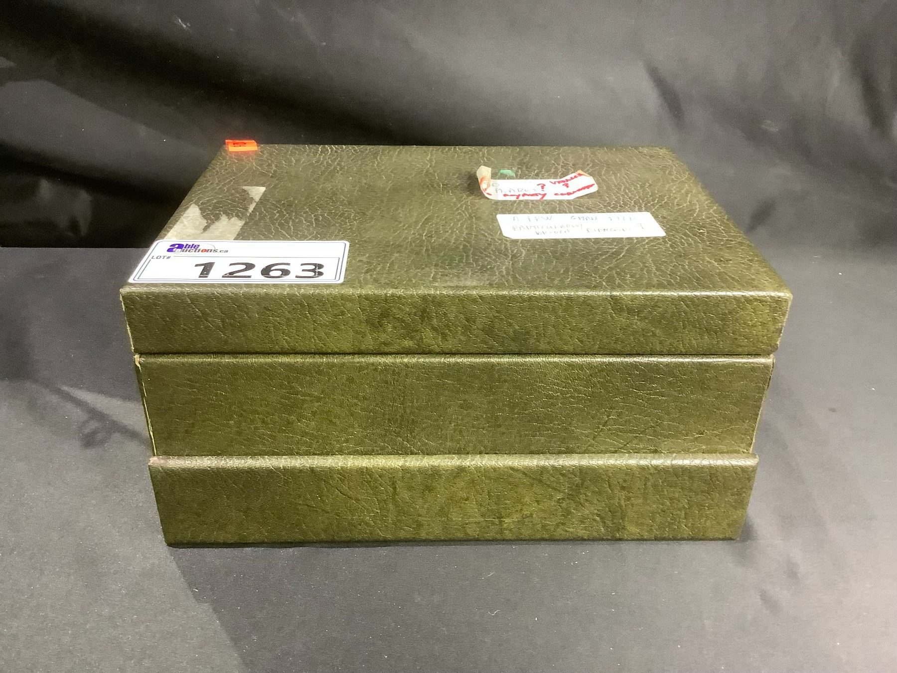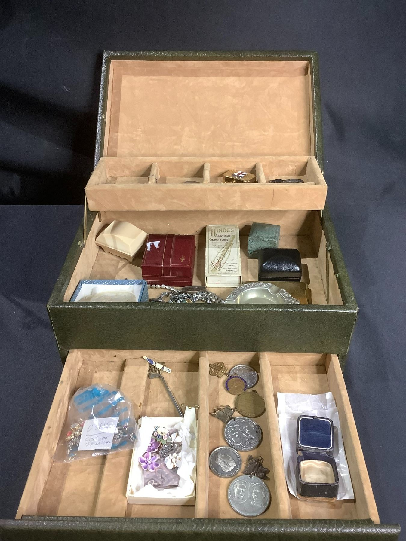 JEWELRY BOX WITH ASSORTED CONTENTS: BROOCHES, NECKLACES, RING, ASHTRAY, & MORE