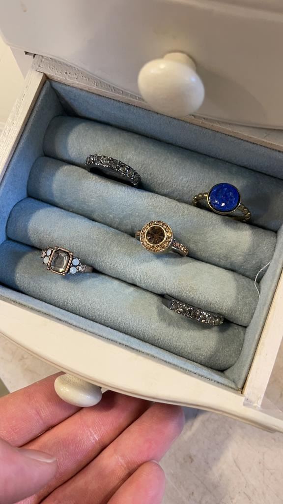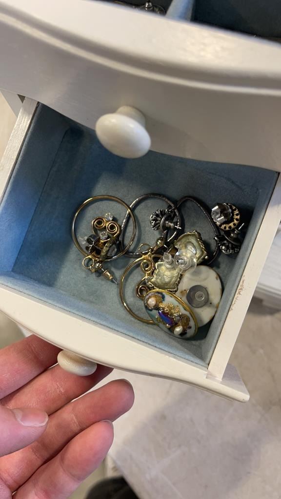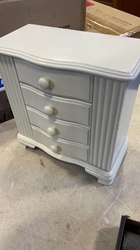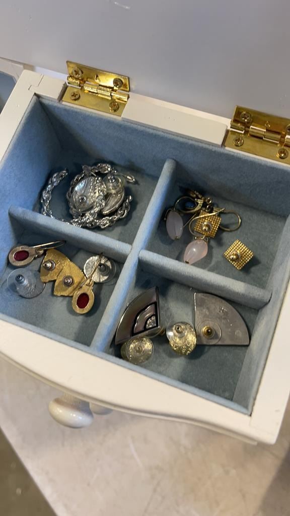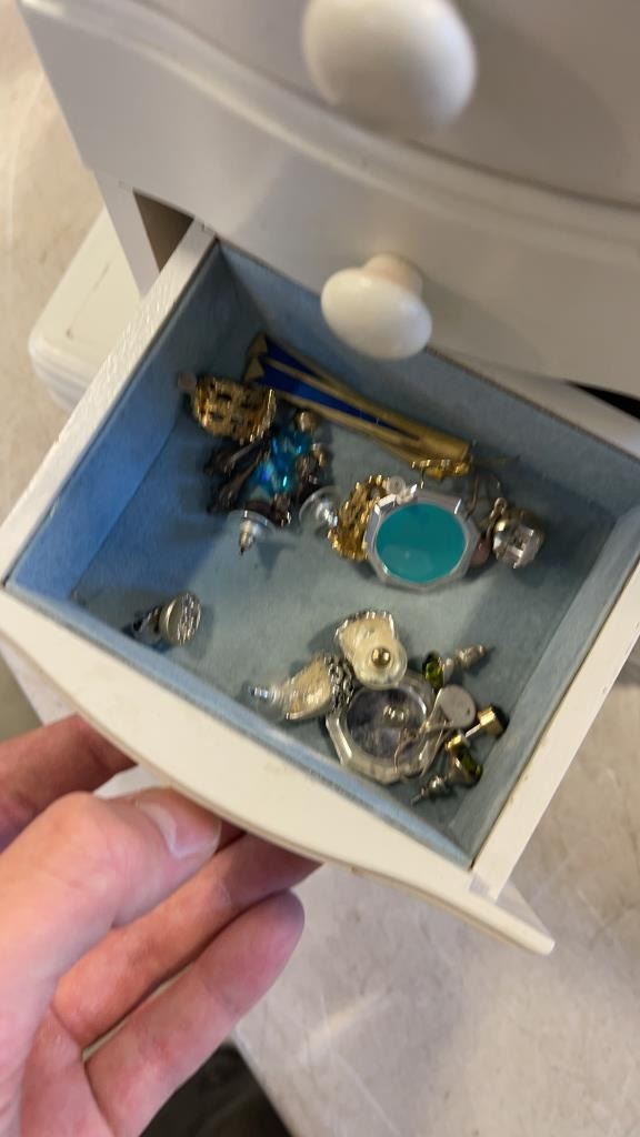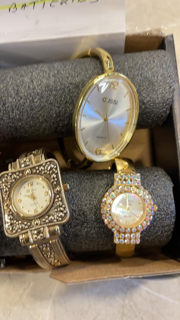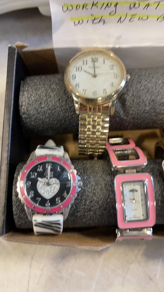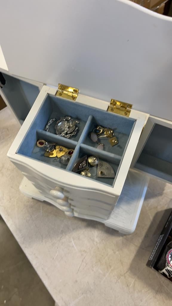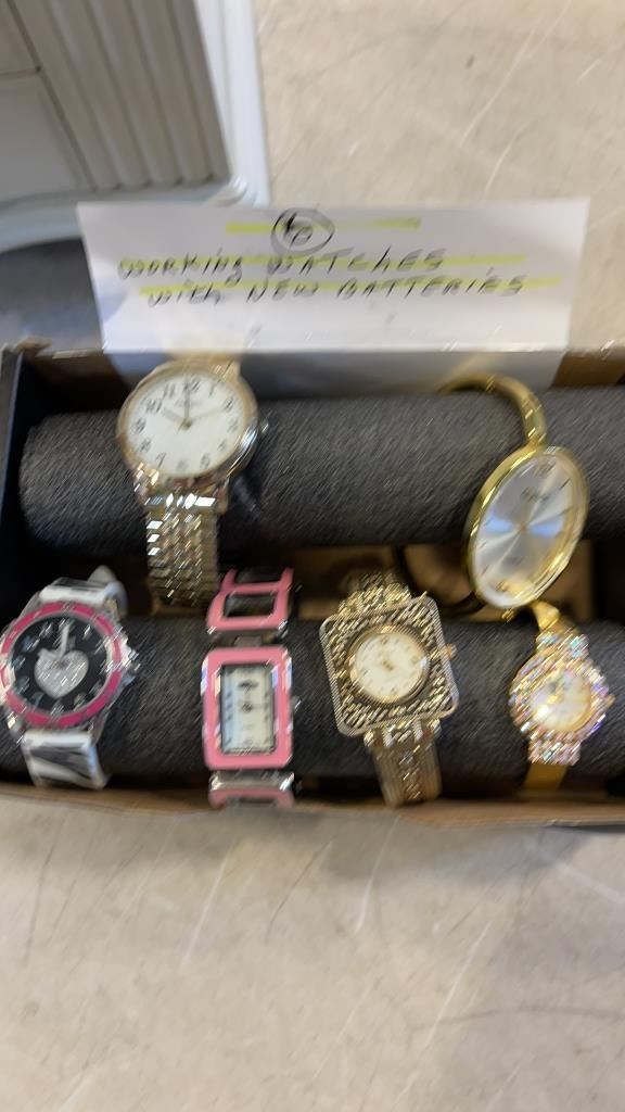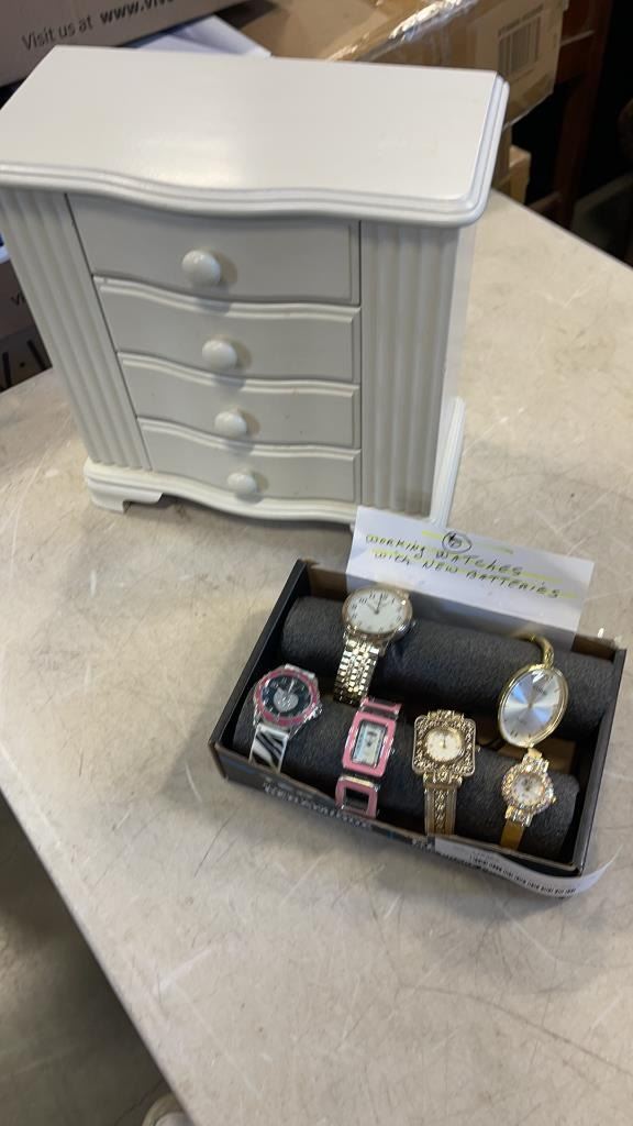 JEWELRY BOX WITH CONTENTS AND 6 WORKING WATCHES